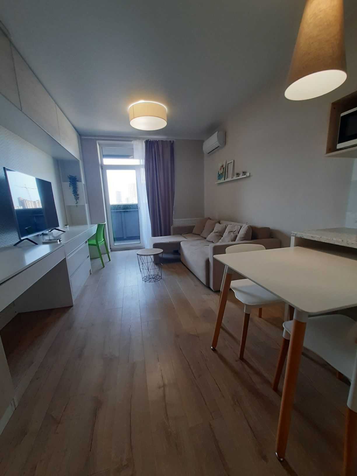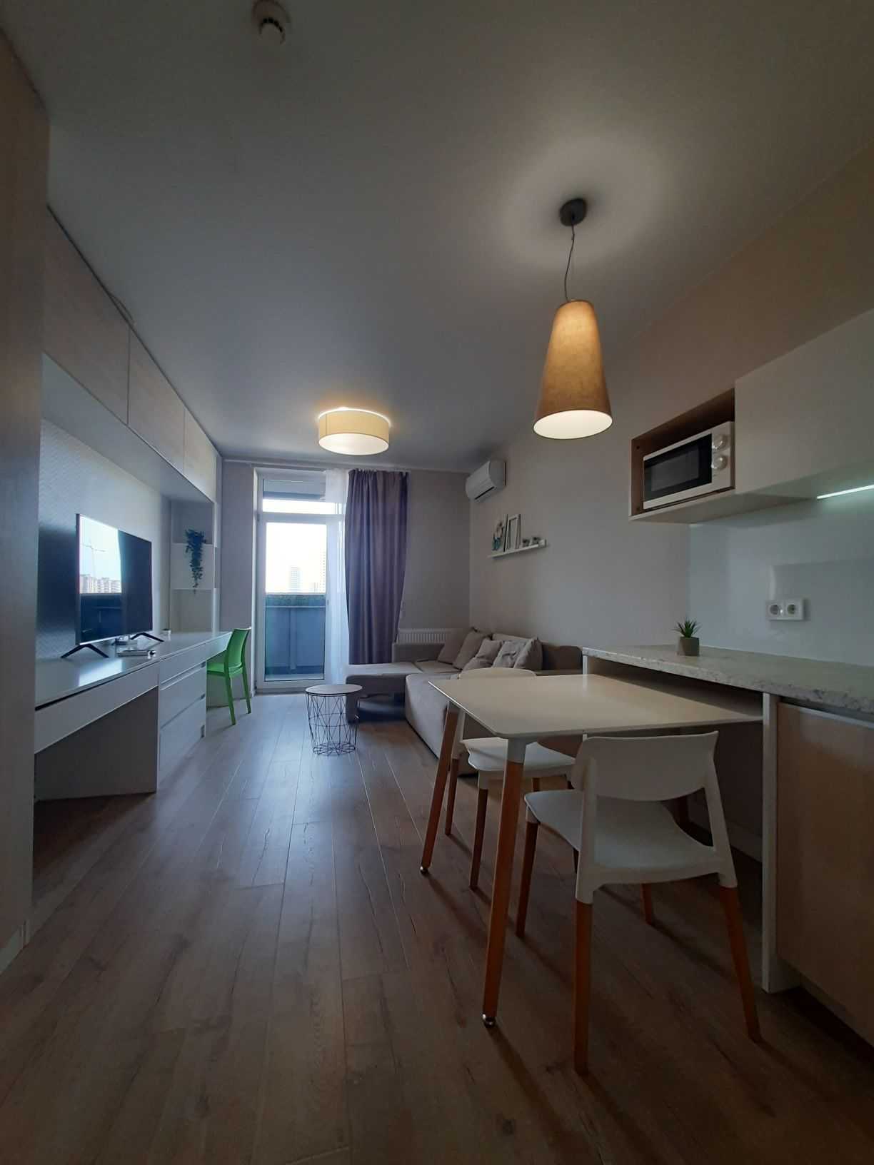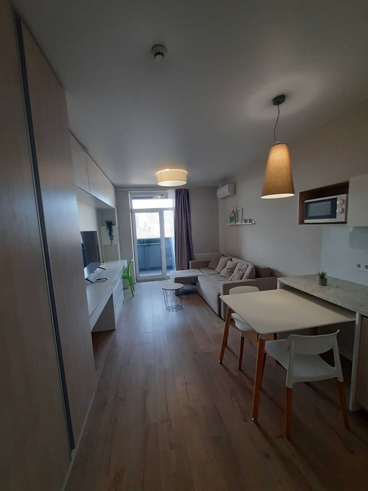 Однокімнатна квартира-студія в ЖК Standard One на вулиці Васильківській, 100 А. Зручне розташування - одна хвилина до метро Виставковий центр. Будинок обладнаний коворкінгом на першому поверсі, який функціонує під час відключення світла, та генератором для забезпечення води і роботи ліфта. Незалежне опалення забезпечується власною котельнею. Закрита територія з охороною створює комфортні умови для проживання.