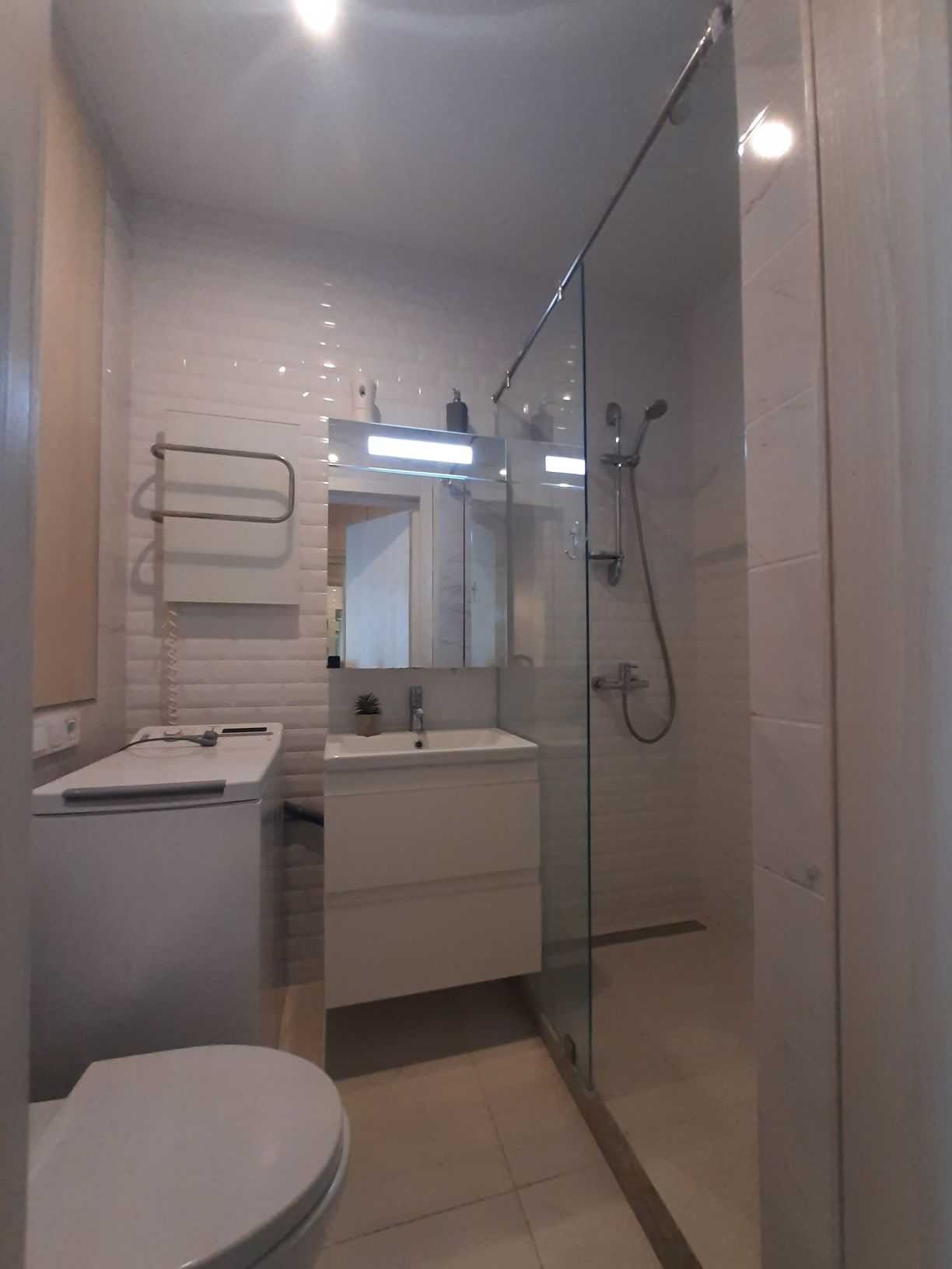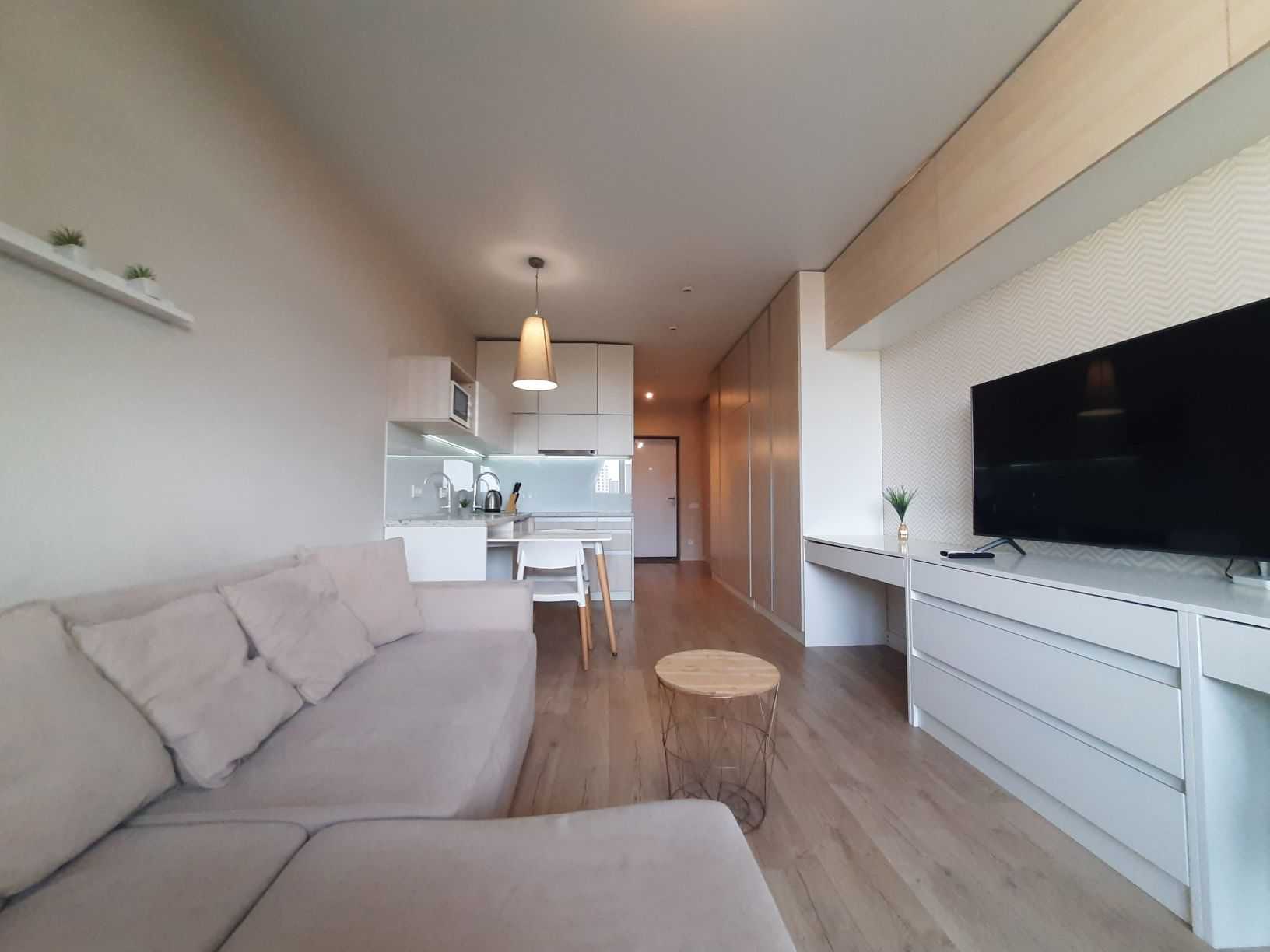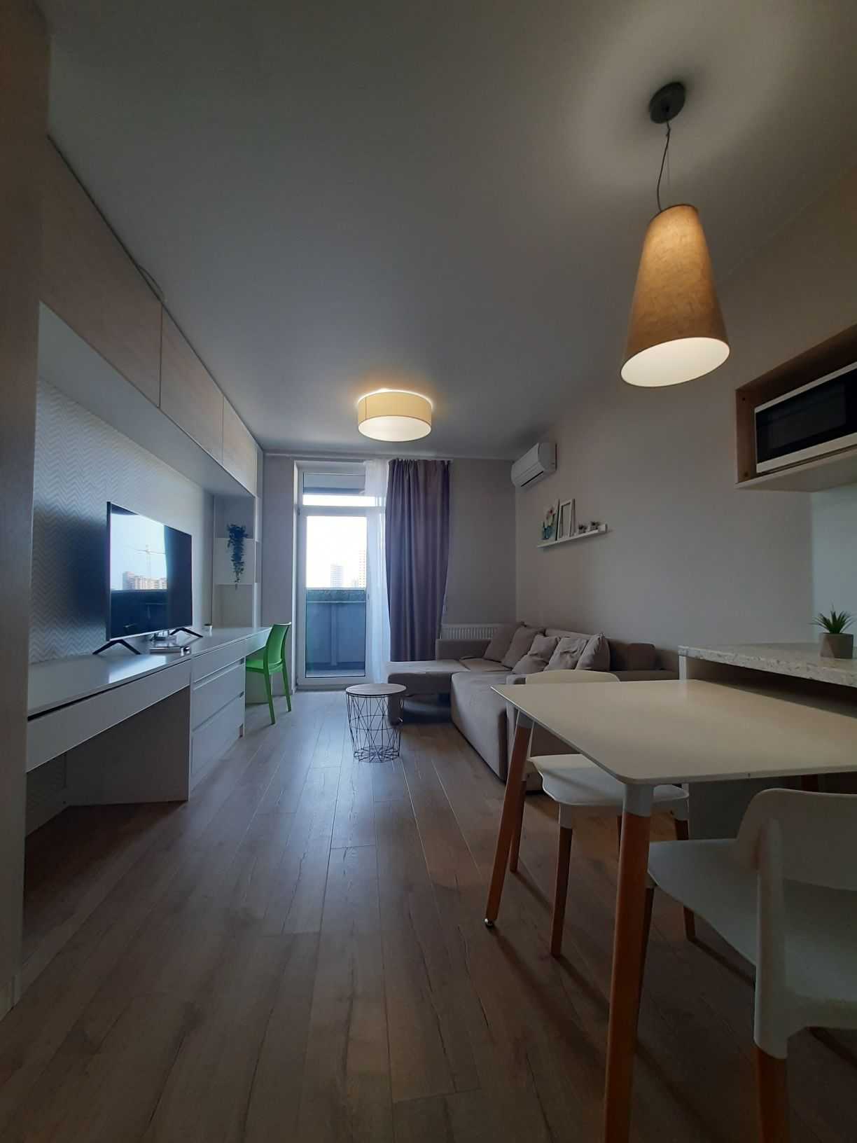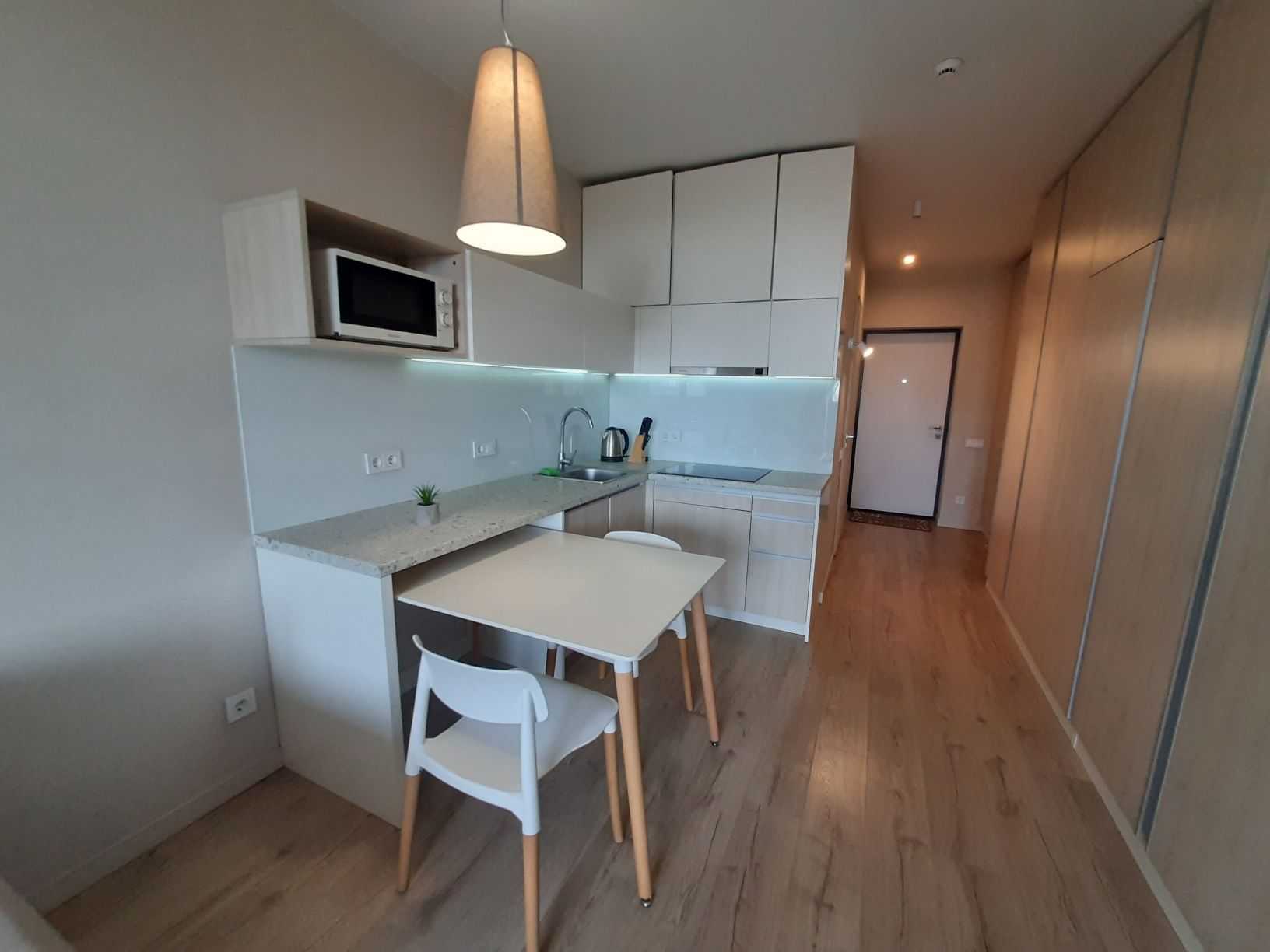 Однокімнатна квартира-студія в ЖК Standard One на вулиці Васильківській, 100 А. Зручне розташування - одна хвилина до метро Виставковий центр. Будинок обладнаний коворкінгом на першому поверсі, який функціонує під час відключення світла, та генератором для забезпечення води і роботи ліфта. Незалежне опалення забезпечується власною котельнею. Закрита територія з охороною створює комфортні умови для проживання.