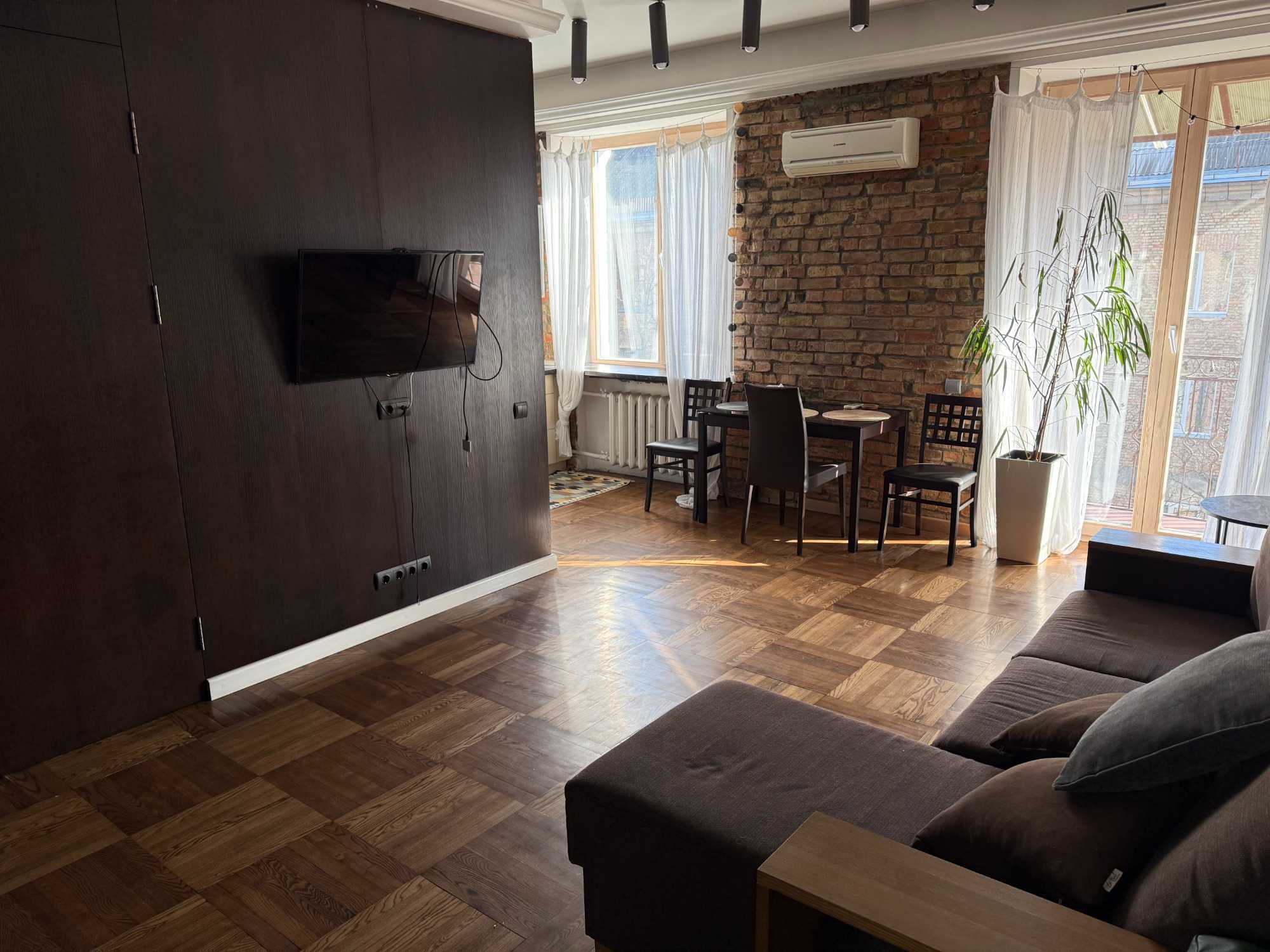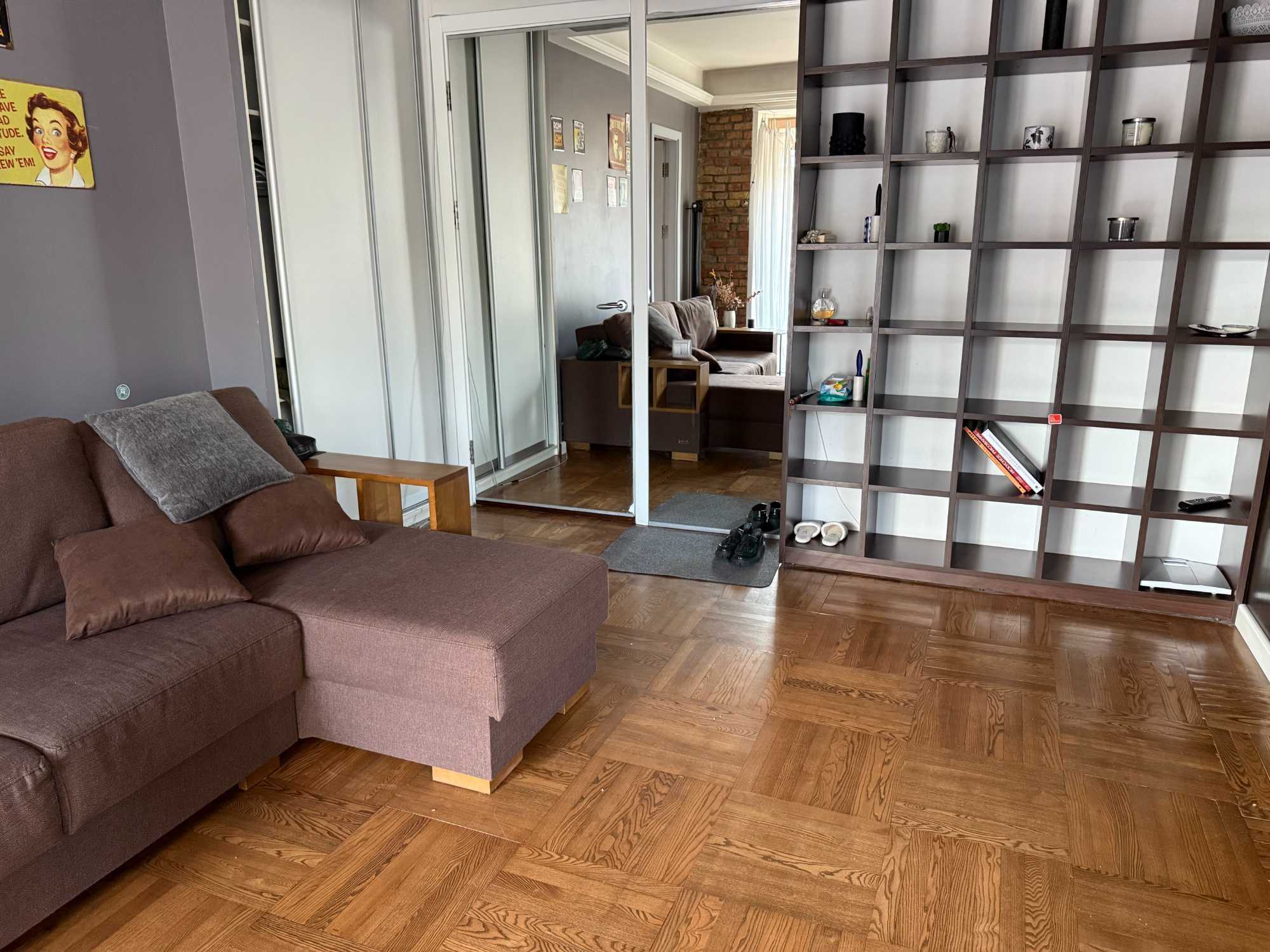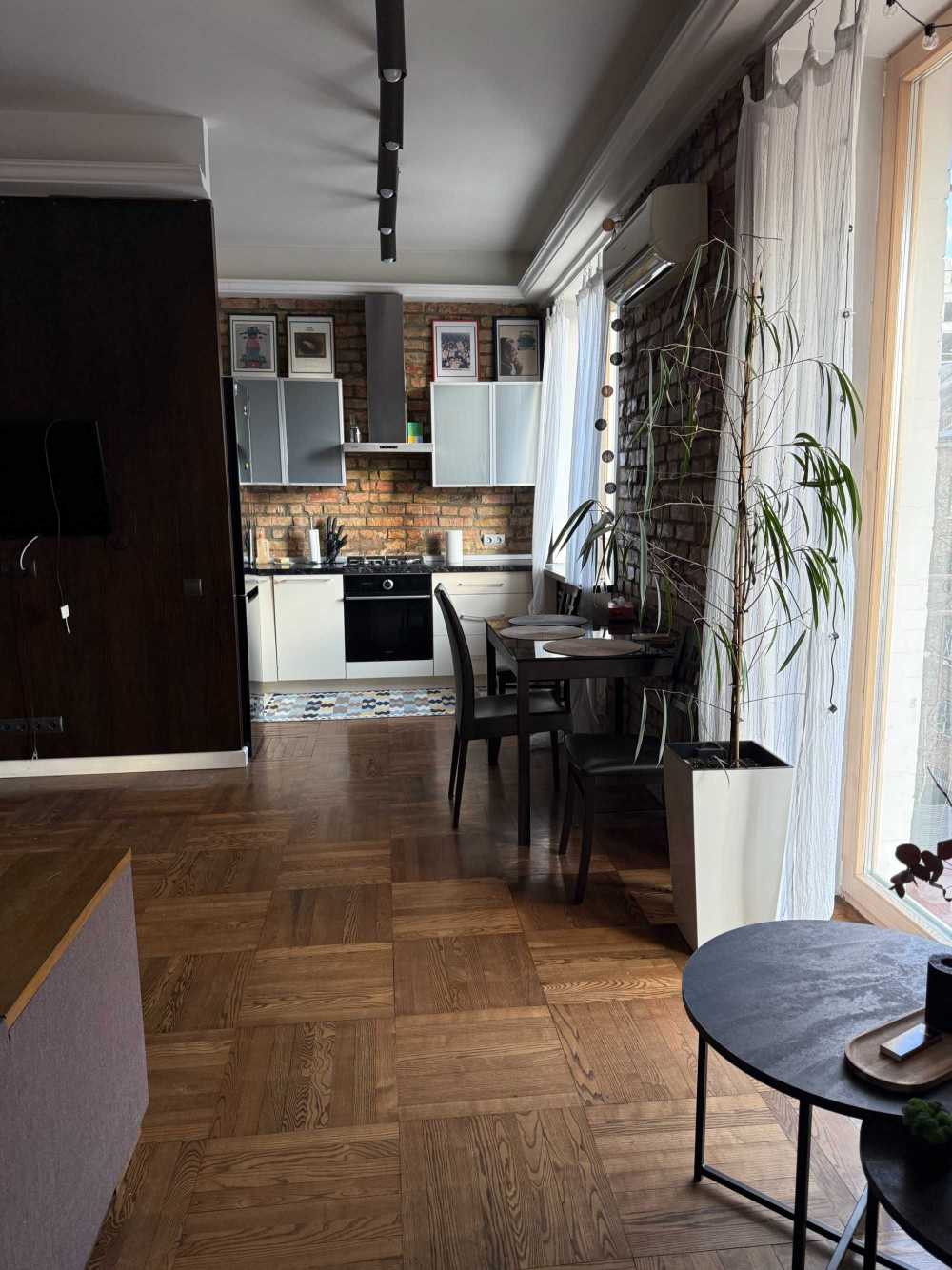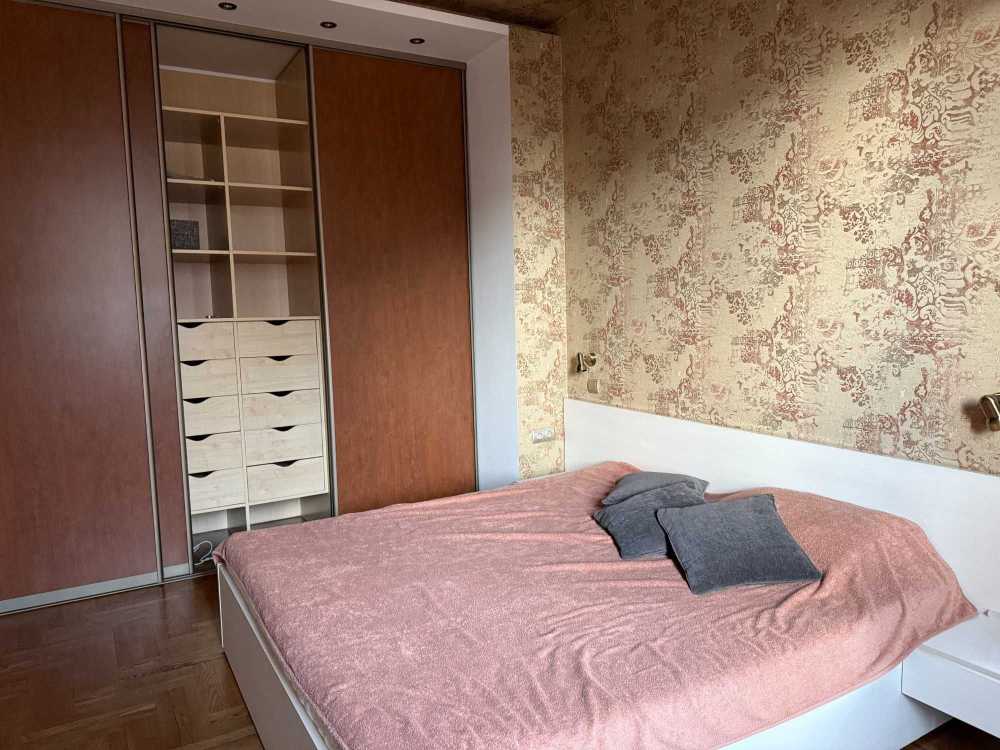 Квартира знаходиться на Печерську, має одну спальню та кухню-студію. У квартирі є балкон, з якого відкривається вид на тихий двір. Кухня обладнана сучасною технікою, включаючи посудомийну машину. Для зручності мешканців передбачено кондиціонери та пральна машина. Дозволено проживання з домашніми тваринами.