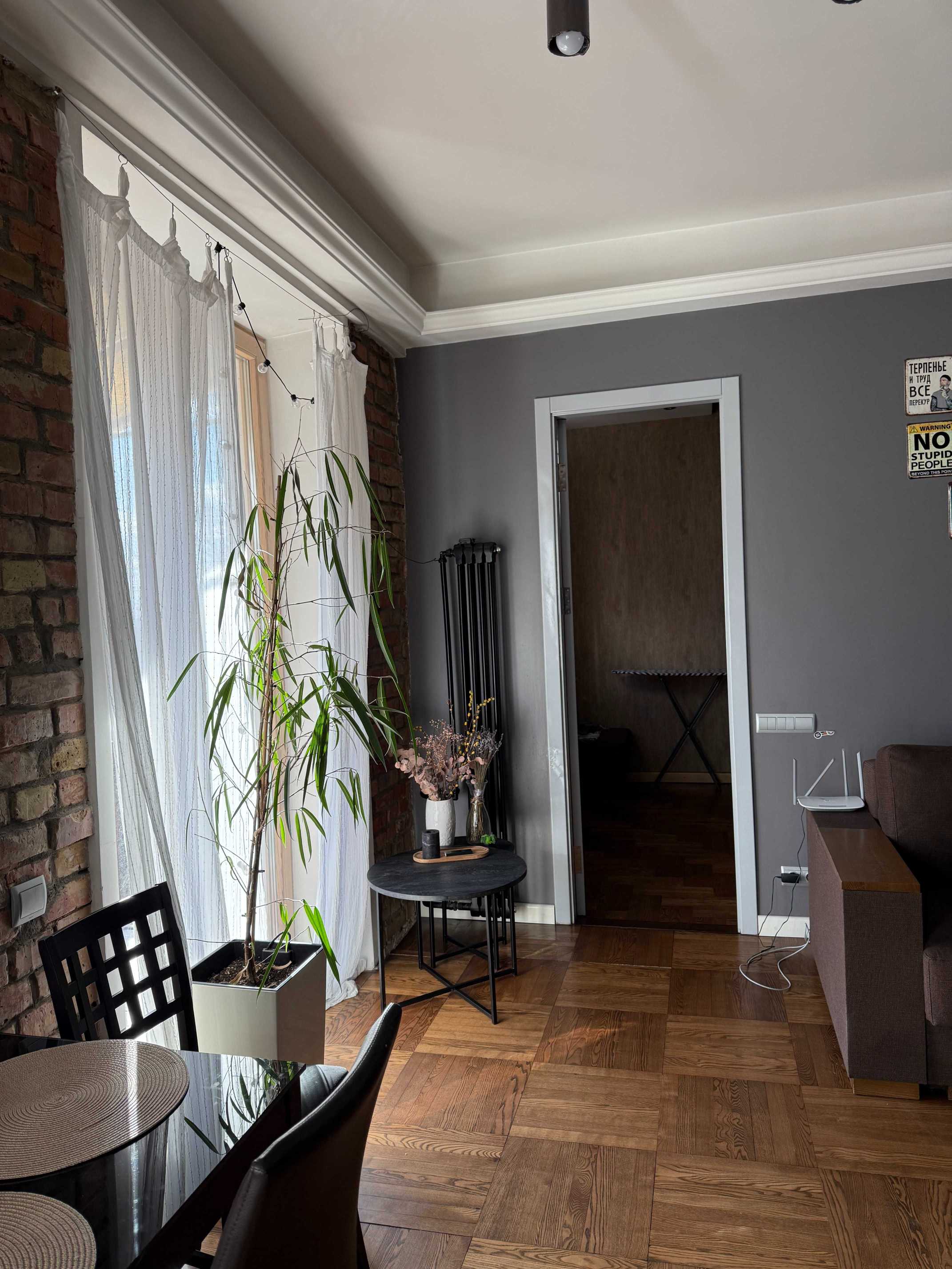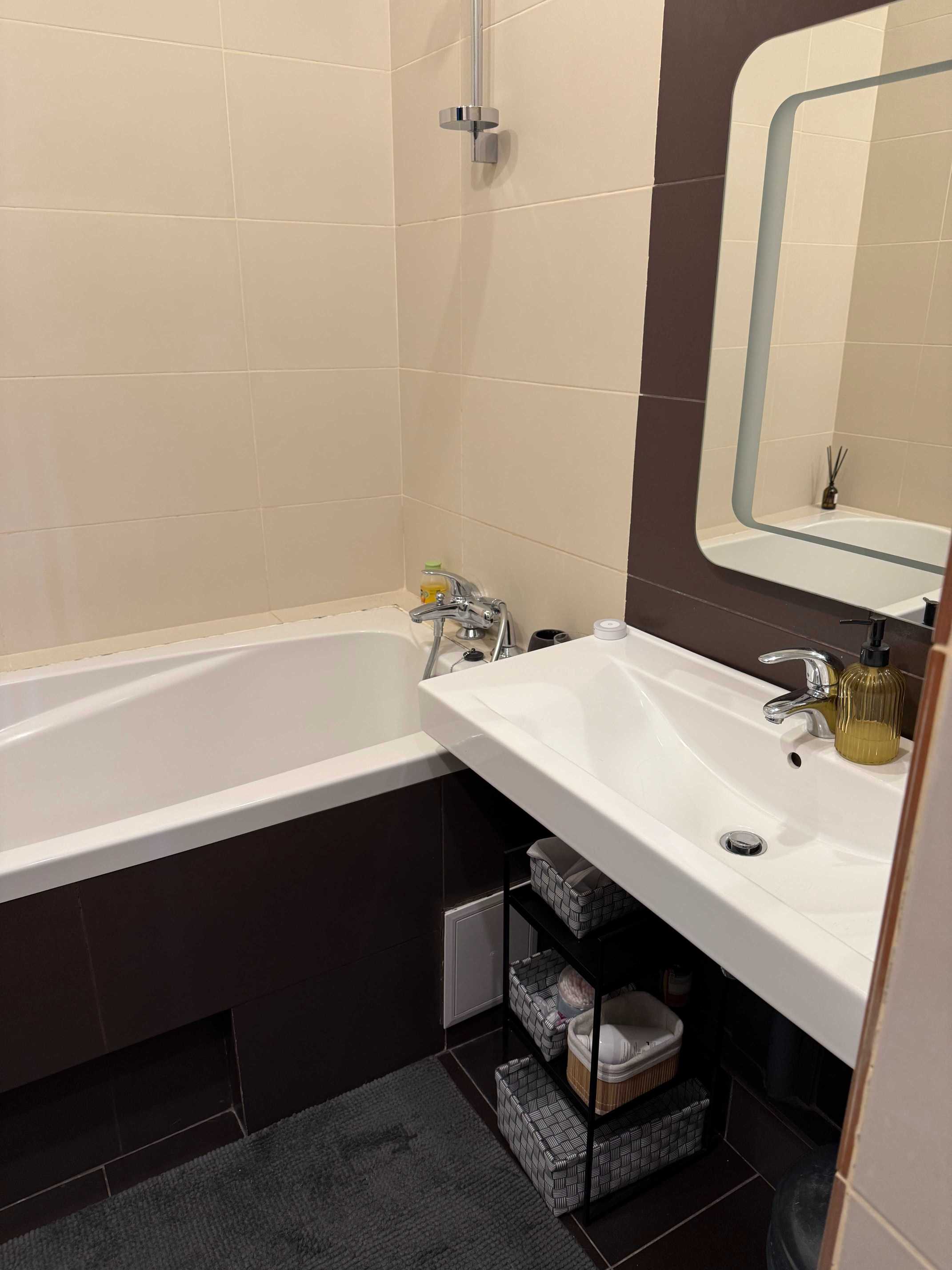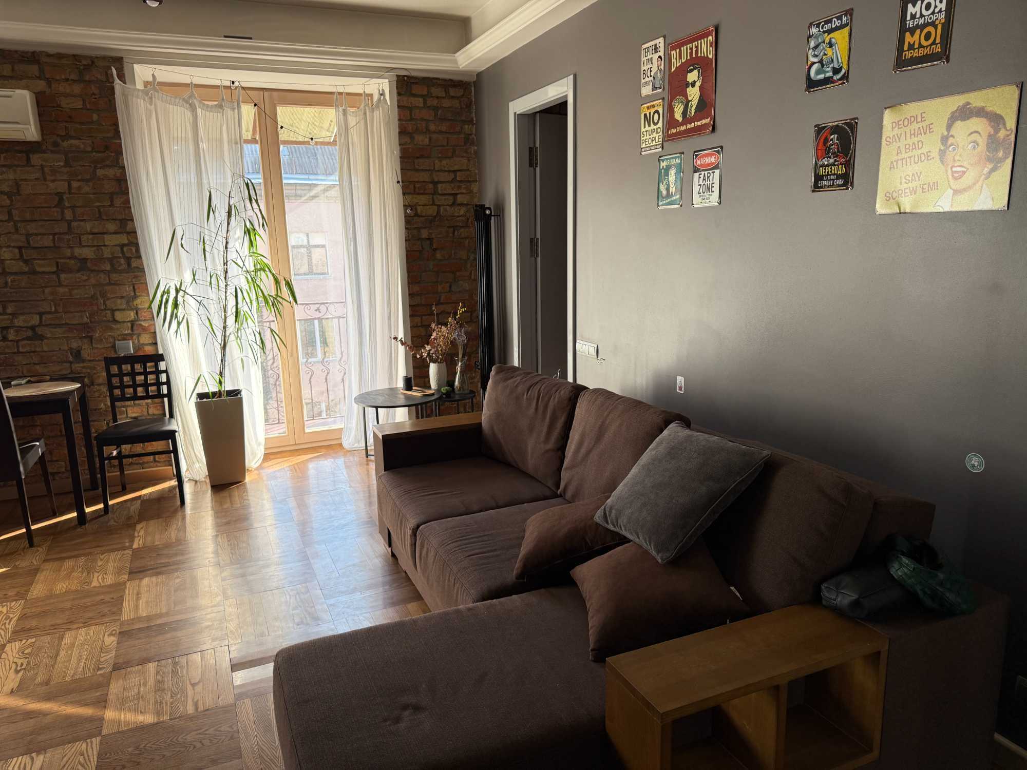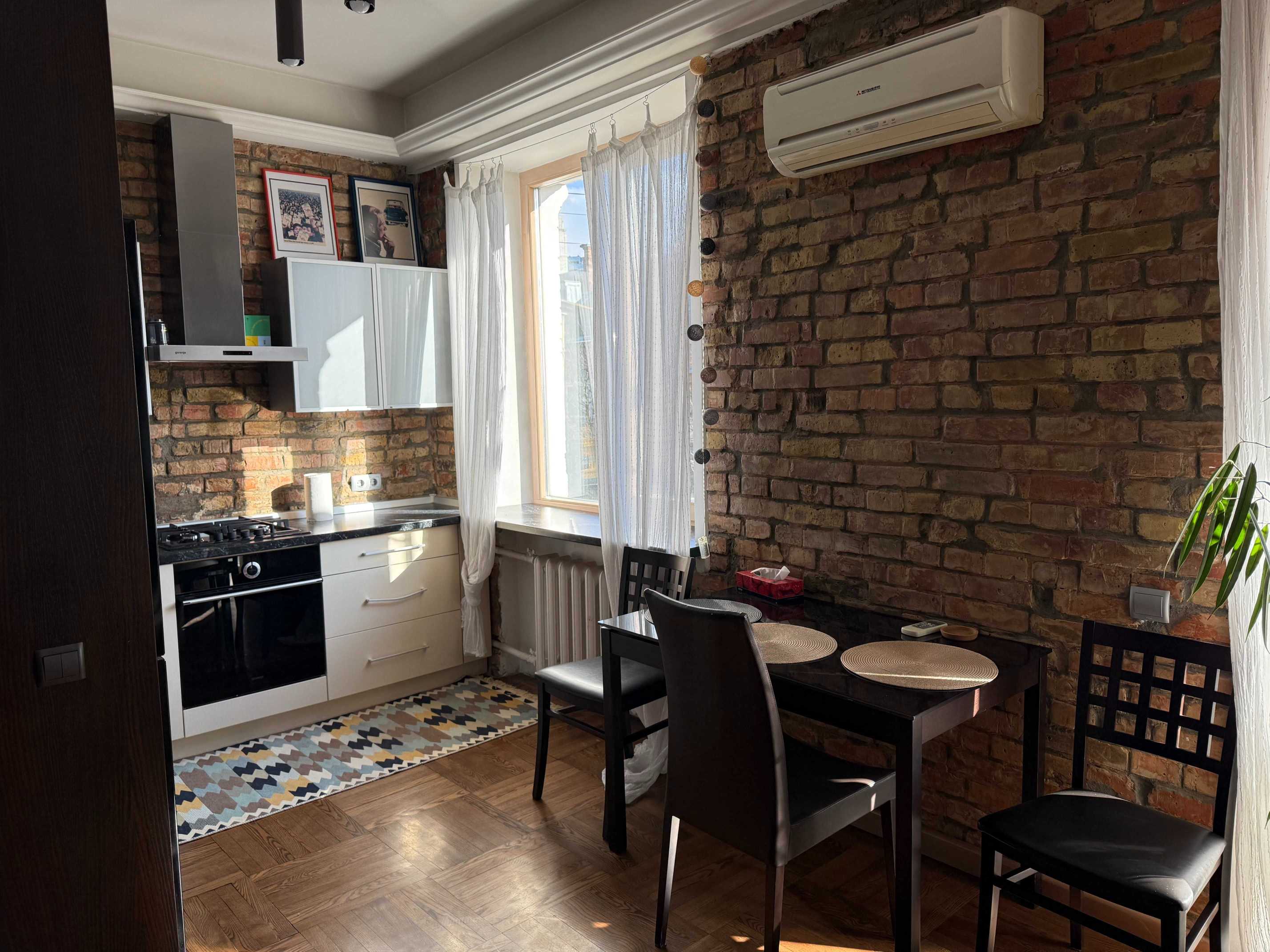 Квартира знаходиться на Печерську, має одну спальню та кухню-студію. У квартирі є балкон, з якого відкривається вид на тихий двір. Кухня обладнана сучасною технікою, включаючи посудомийну машину. Для зручності мешканців передбачено кондиціонери та пральна машина. Дозволено проживання з домашніми тваринами.