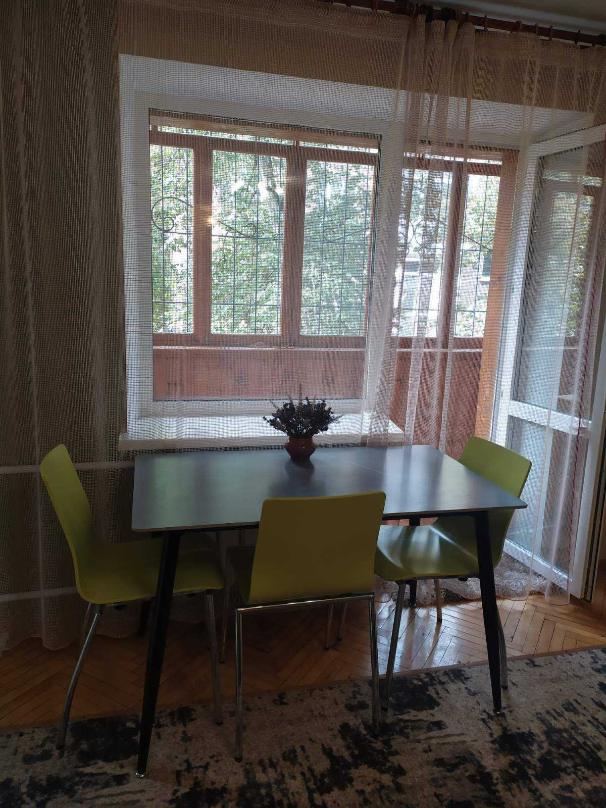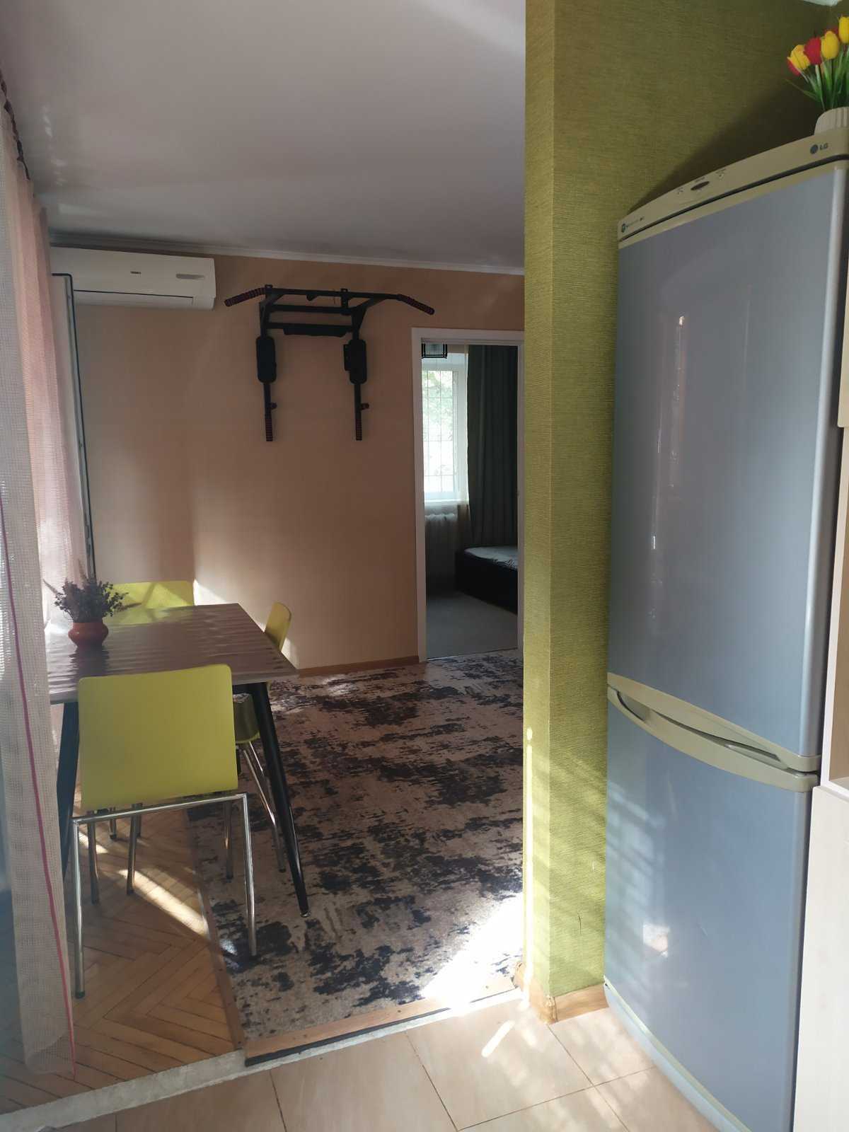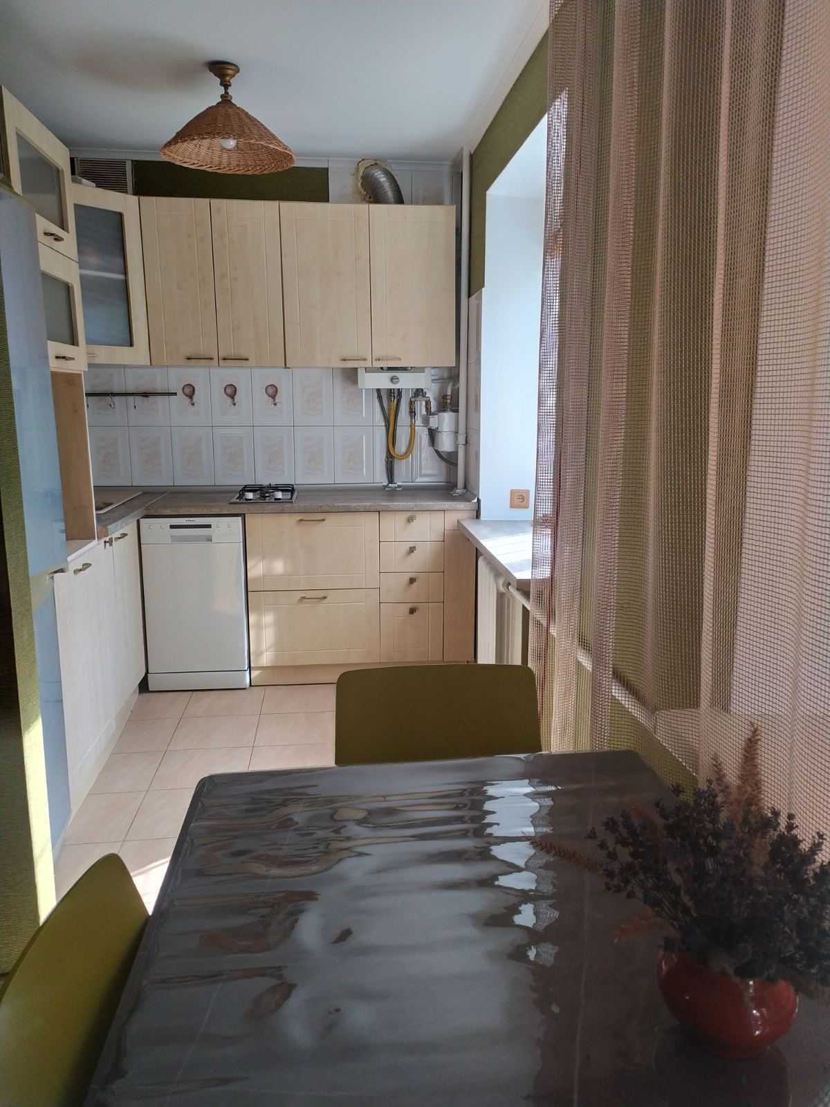 Оормлена 2-кімнатна квартира у Києві, на проспекті Берестейському, 106 А, знаходиться на 2-му поверсі 5-поверхового будинку. Загальна площа – 46,2 м², кімнати роздільні. Квартира оснащена сучасними меблями та технікою. Спальня містить двоспальне ліжко з ортопедичним матрацом, гардероб, а у вітальні – комфортний диван, кондиціонер та настінний турнік. Кухня забезпечена газовою плитою, холодильником та необхідним посудом. У ванній кімнаті – ванна та пральна машинка. Є інтернет. Двір облаштований дитячим та спортивним майданчиком, неподалік – метро Святошин, магазини, школи і кафе. Зауважте, що паління в квартирі заборонено.