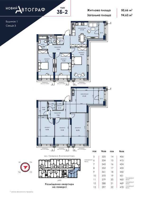 Трикімнатна квартира розташована на 8 поверсі будинку 1 комплексу ЖК "Новий Автограф" в Києві. Загальна площа становить 96 м². Квартира містить три окремі кімнати, кухню-вітьалню і два роздільних санвузли. Вхідна зона облаштована гардеробною. Будинок побудований за монолітно-каркасною технологією з червоної цегли, що забезпечує гарну шумоізоляцію. Вікна мають двокамерні склопакети. Комплекс обладнаний підземним паркінгом, дитячим та спортивним майданчиками, а також цілодобовим відеоспостереженням. Поруч оновлений парк "Перемога".