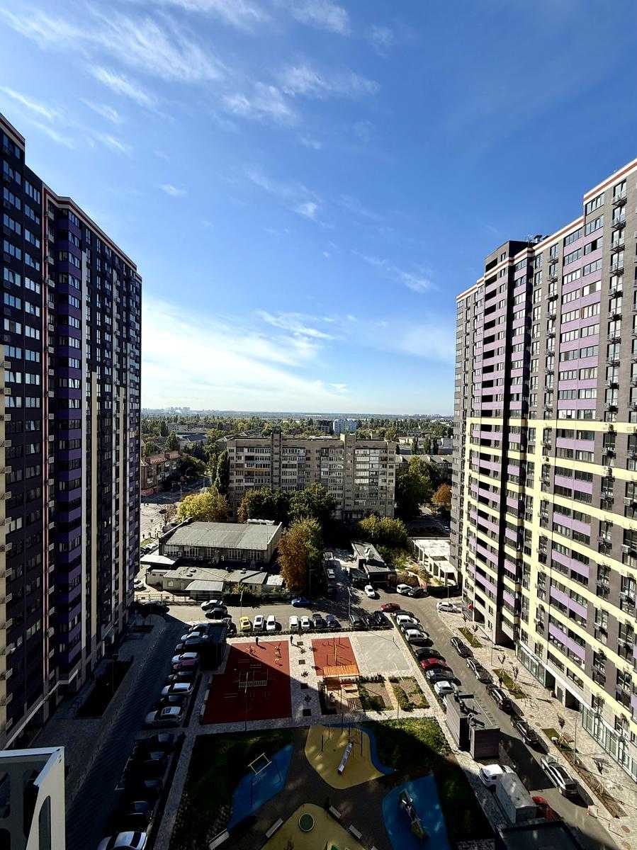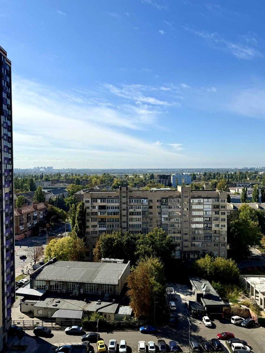 Квартира розташована в житловому комплексі OK'LAND на Повітряних Силах в Солом'янському районі Києва. Наявна кухня площею 18 кв.м та кімната площею 15 кв.м, що забезпечує комфортне розміщення. З вікон відкривається гарний вид на місто. У квартирі виконано лазерну стяжку на підлозі, встановлені радіатори, що додає зручності. Комплекс має закриту територію з пропускною системою, цілодобову охорону та відеоспостереження. Вся інфраструктура у пішій доступності: магазини, школи, садки та транспортні зупинки.