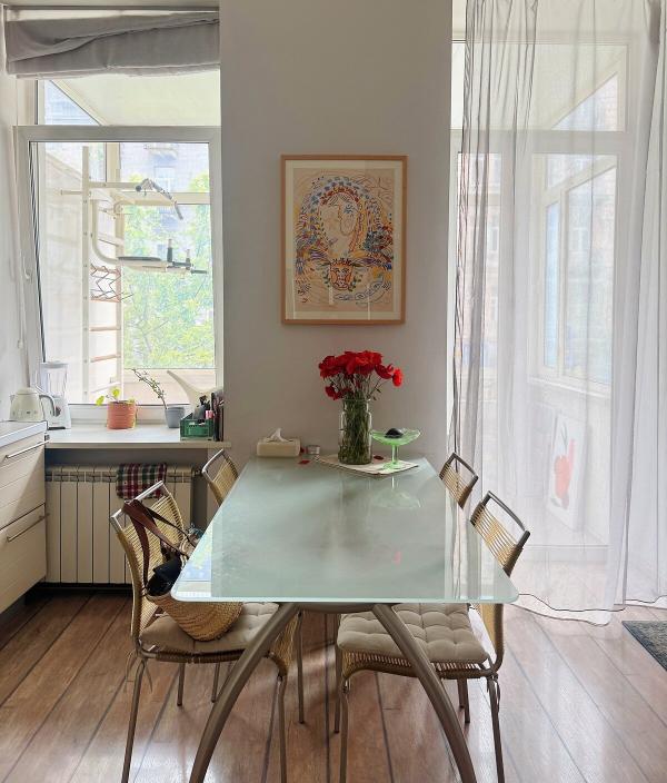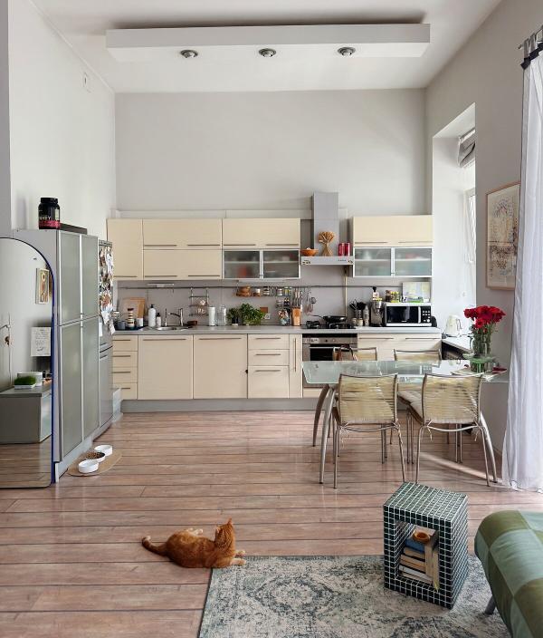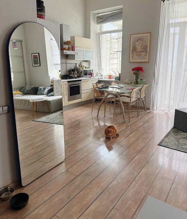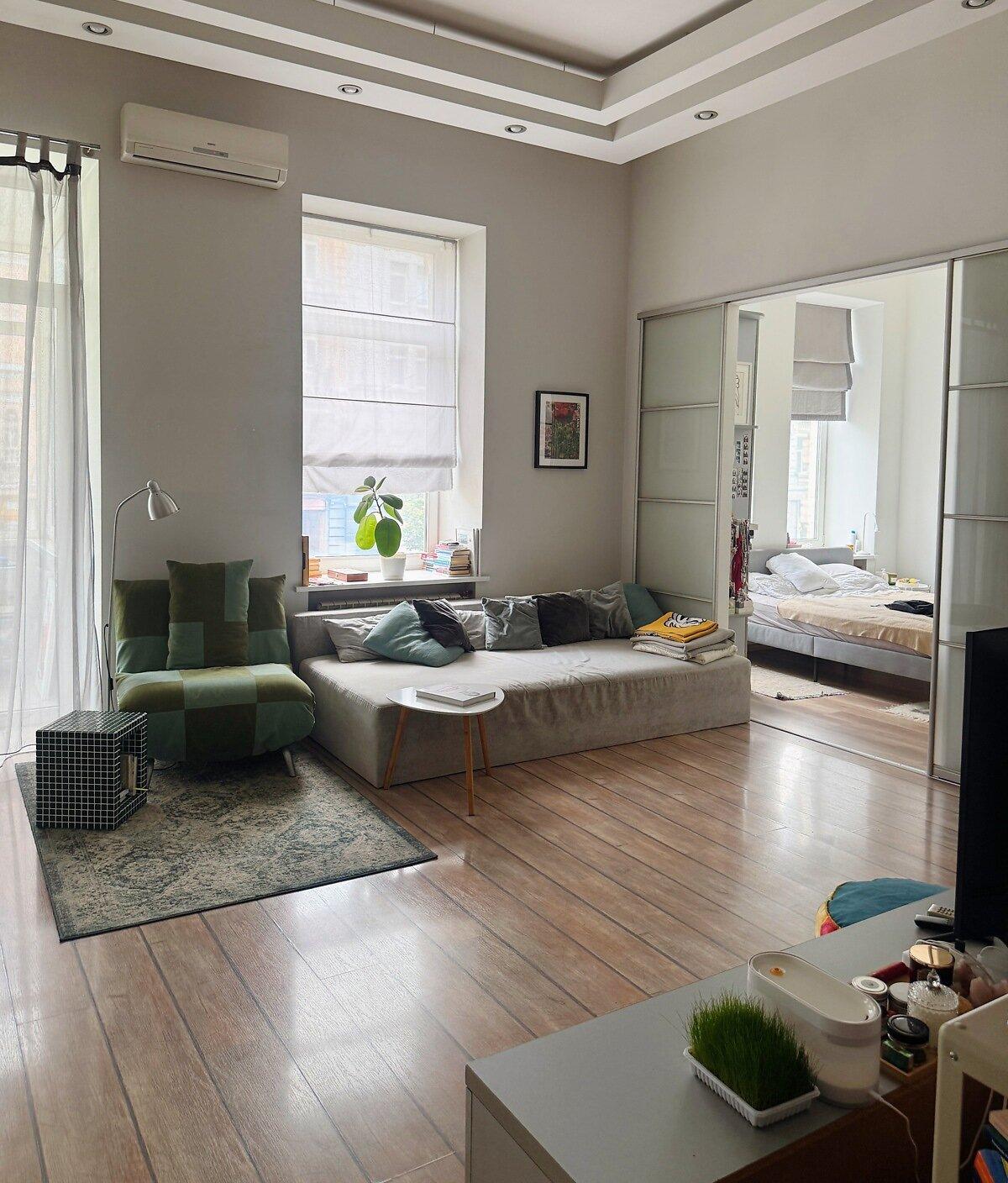 Простора та світла квартира, розташована між станціями метро Олімпійська та Площа Українських Героїв на вулиці Саксаганського. В квартирі великий зал-кухня-студія, окрема спальня з кондиціонером, ванна кімната з ванною, душем, биде та газовим котлом. Знаходиться на другому поверсі, є пасажирський ліфт. Висота стель близько 3.8 метра. Можливо проживання з домашніми тваринами та дітьми. Внутрішній двір з парковкою на 1-2 автомобілі, вхід у будинок за допомогою пульта, також є домофон.