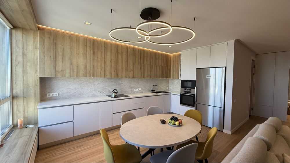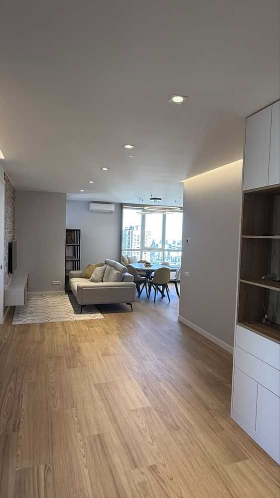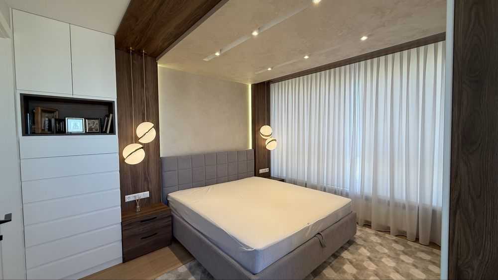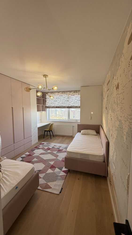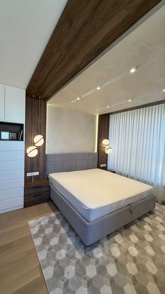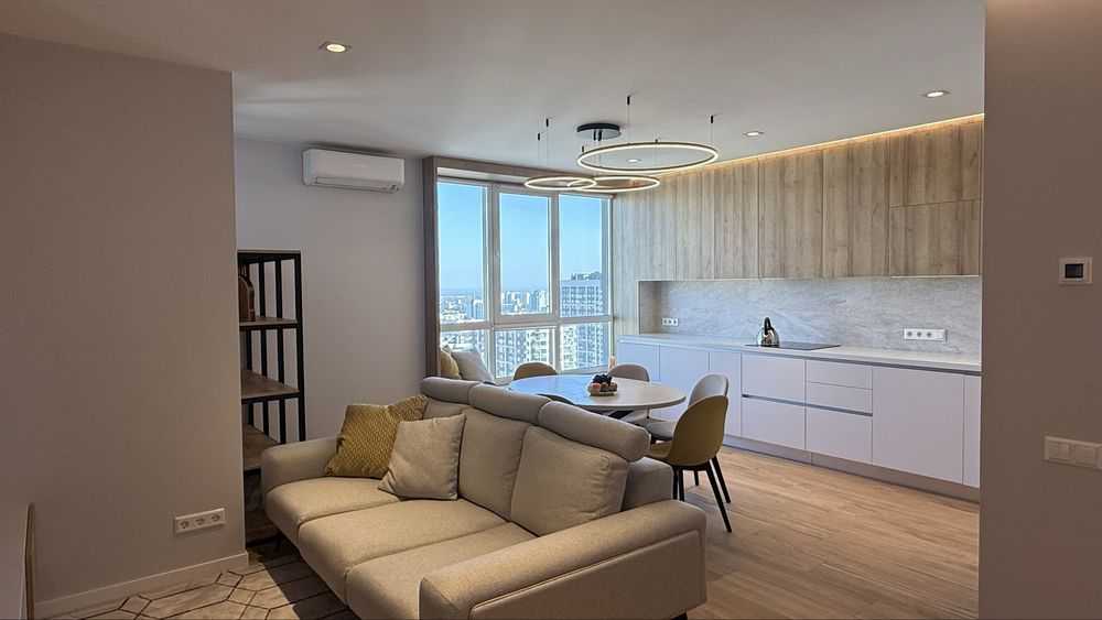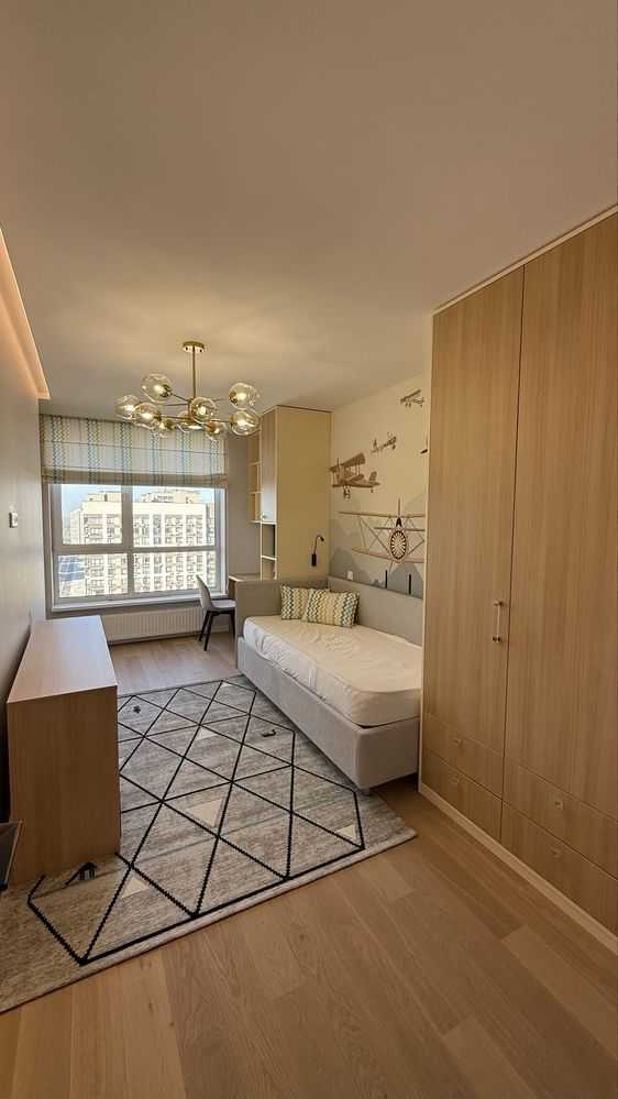 Пропонується в оренду стильна трьохкімнатна квартира з дизайнерським ремонтом на вулиці О.Олеся 4а в ЖК Варшавський. Квартира має три окремі спальні та велику кухню-вітальню, оснащену вбудованою кухнею і сучасною побутовою технікою. Встановлені італійські меблі, зокрема диван, стіл і стільці, а також телевізор. Спальні обладнані ліжками з ортопедичними матрацами і вбудованими шафами. Два санвузли, гардеробна кімната та тепла підлога додають зручностей. Панорамний вигляд і тихе подвір'я роблять квартиру ідеальною для великої сім'ї.