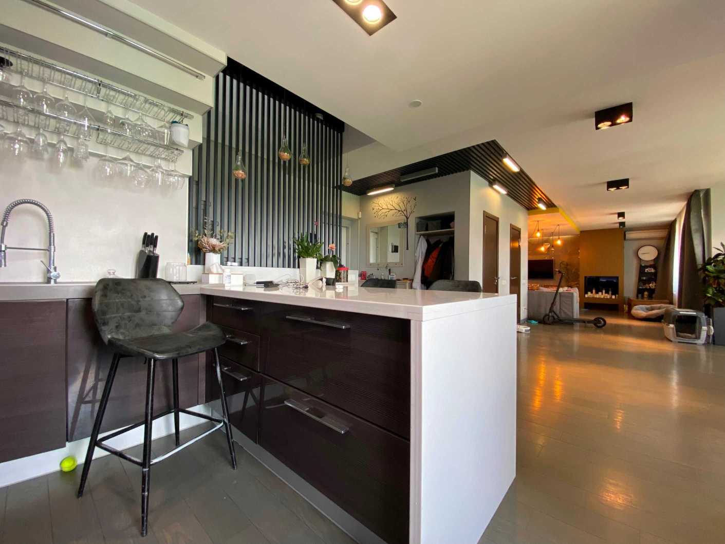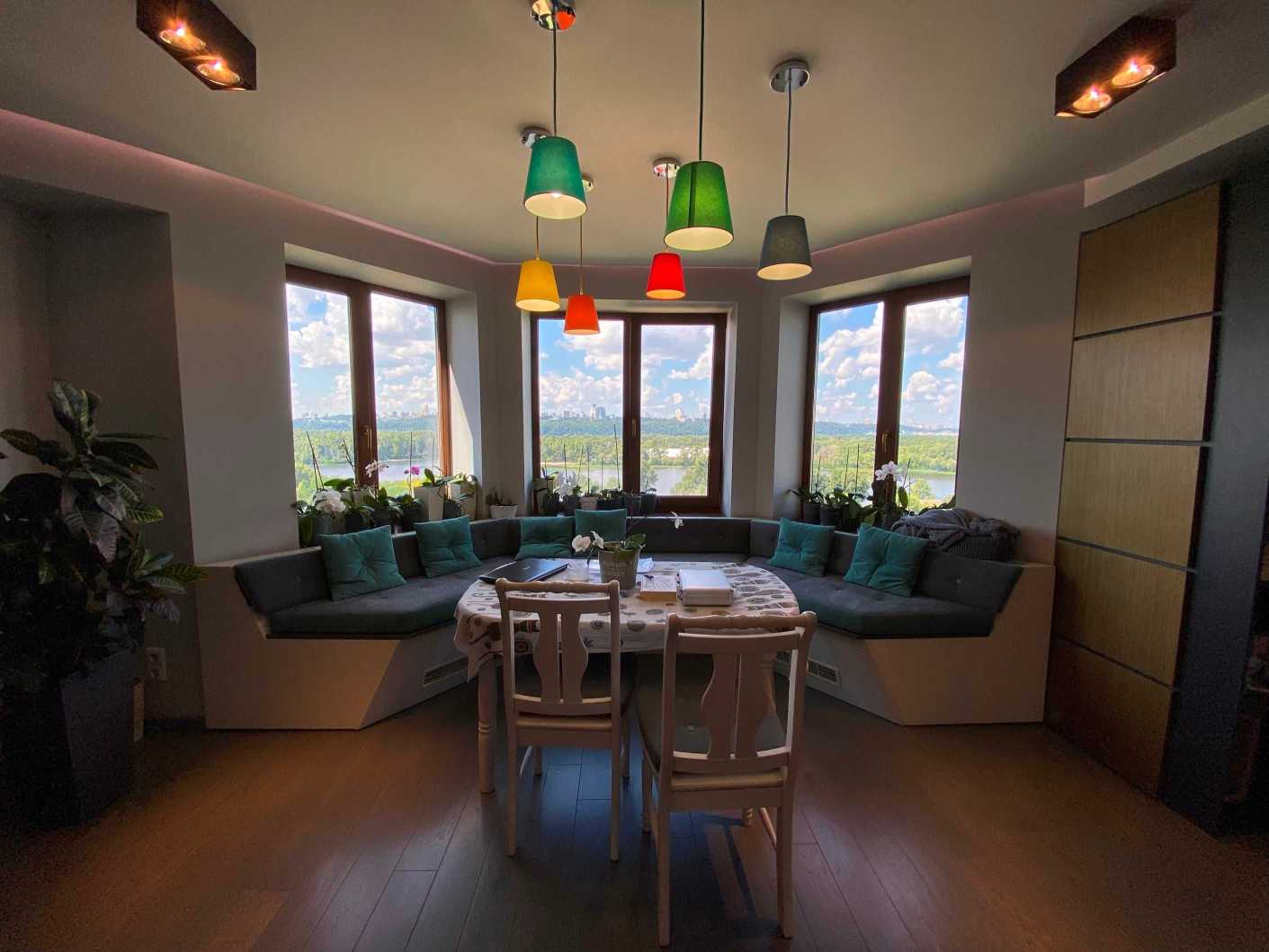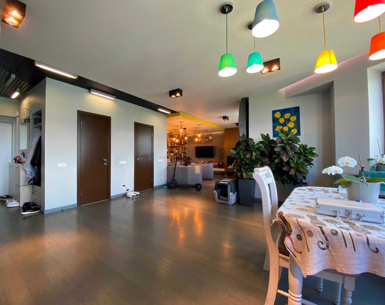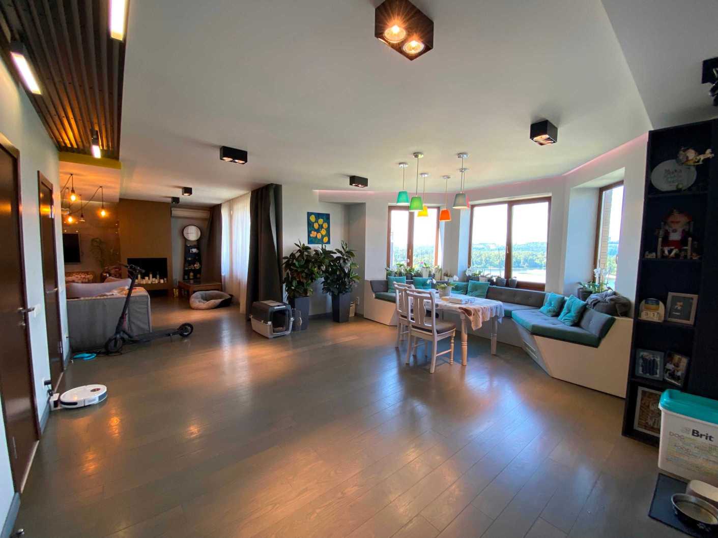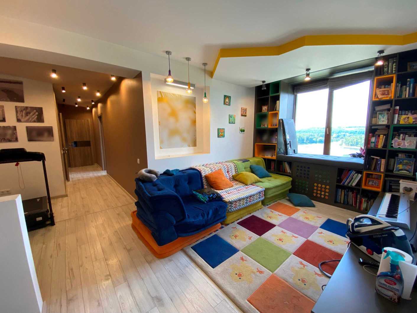 Пропонується дворунева квартира на вул. Микільсько-Слобідській, 4Д, загальною площею 222 м2, розташована на 10-11 поверхах цегляного будинку. В квартирі 6 кімнат, з яких 5 окремих спалень, 3 санвузли та простора кухня-столова. Вікна виходять на Дніпро та панораму Києва. Перший рівень містить затишну вітальню, кухню, балкон з краєвидом та гостьовий санвузол. Другий рівень пропонує 4 дитячі кімнати, спальню для батьків, ігрову зону та два балкони. Ідеальне місце для великої родини поруч з набережною, парками та мережею супермаркетів.