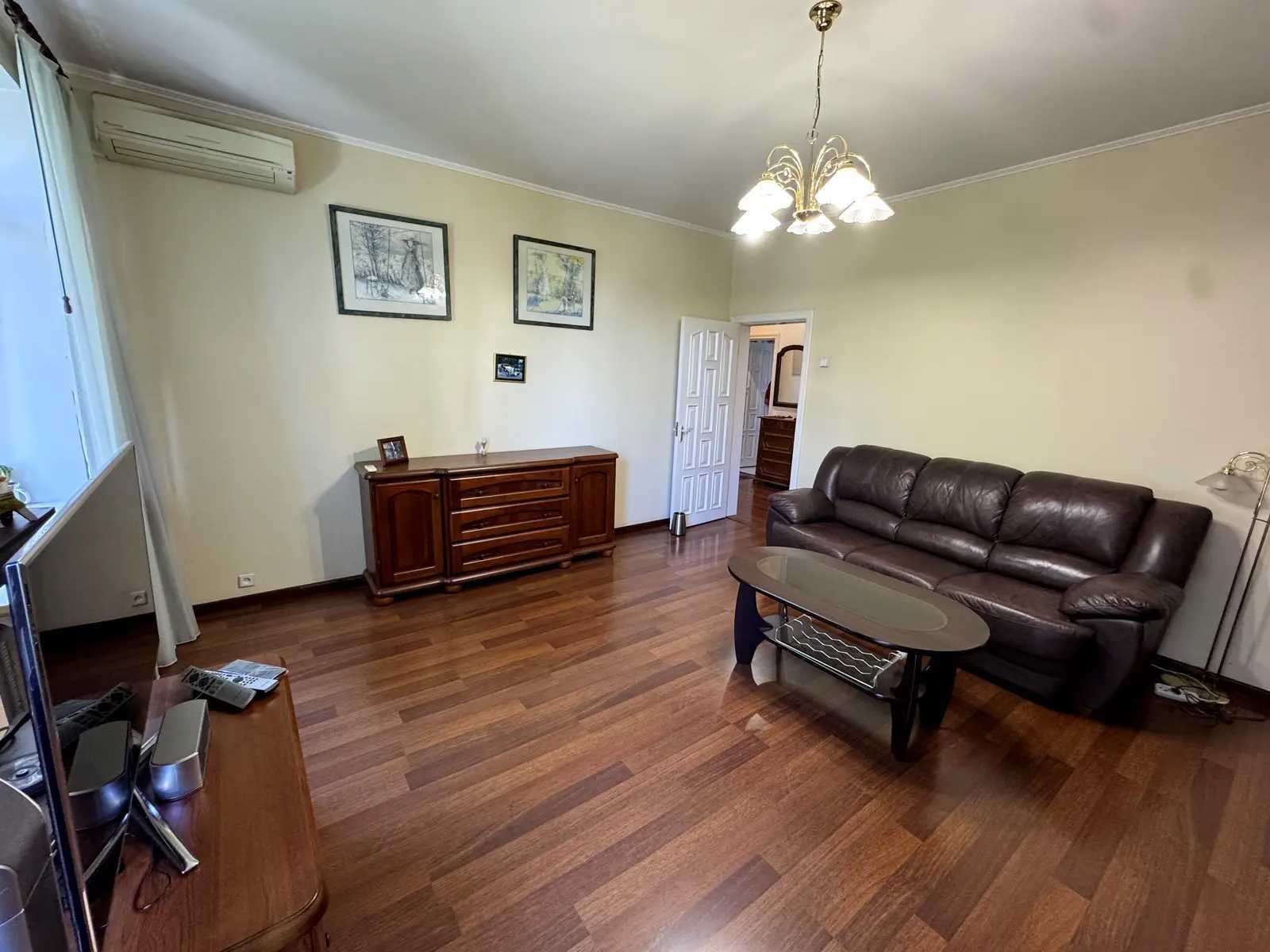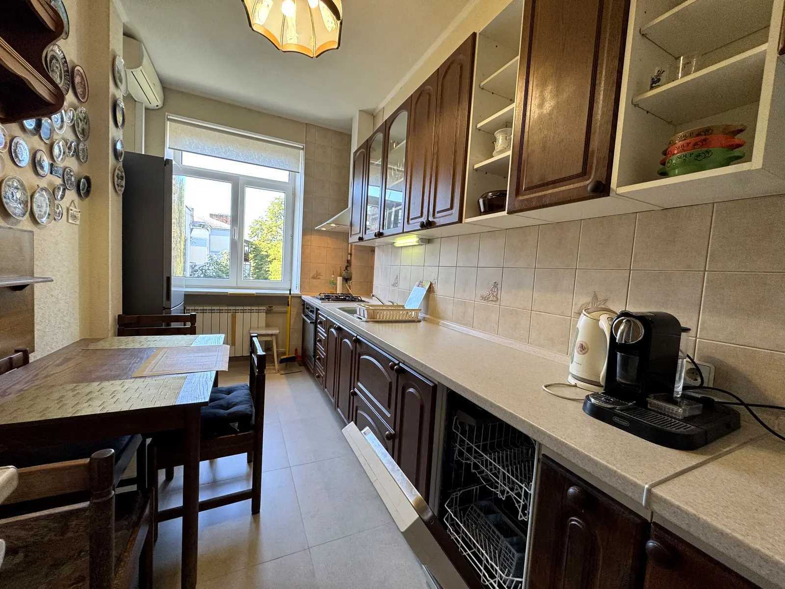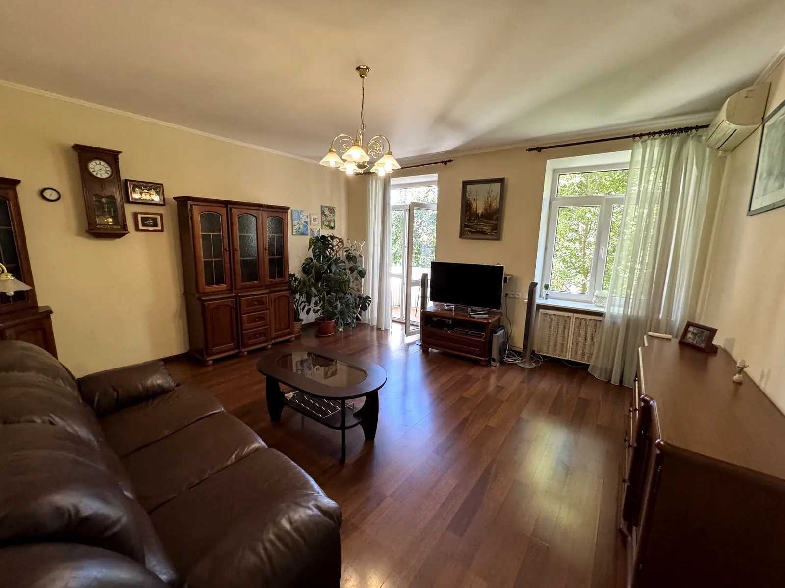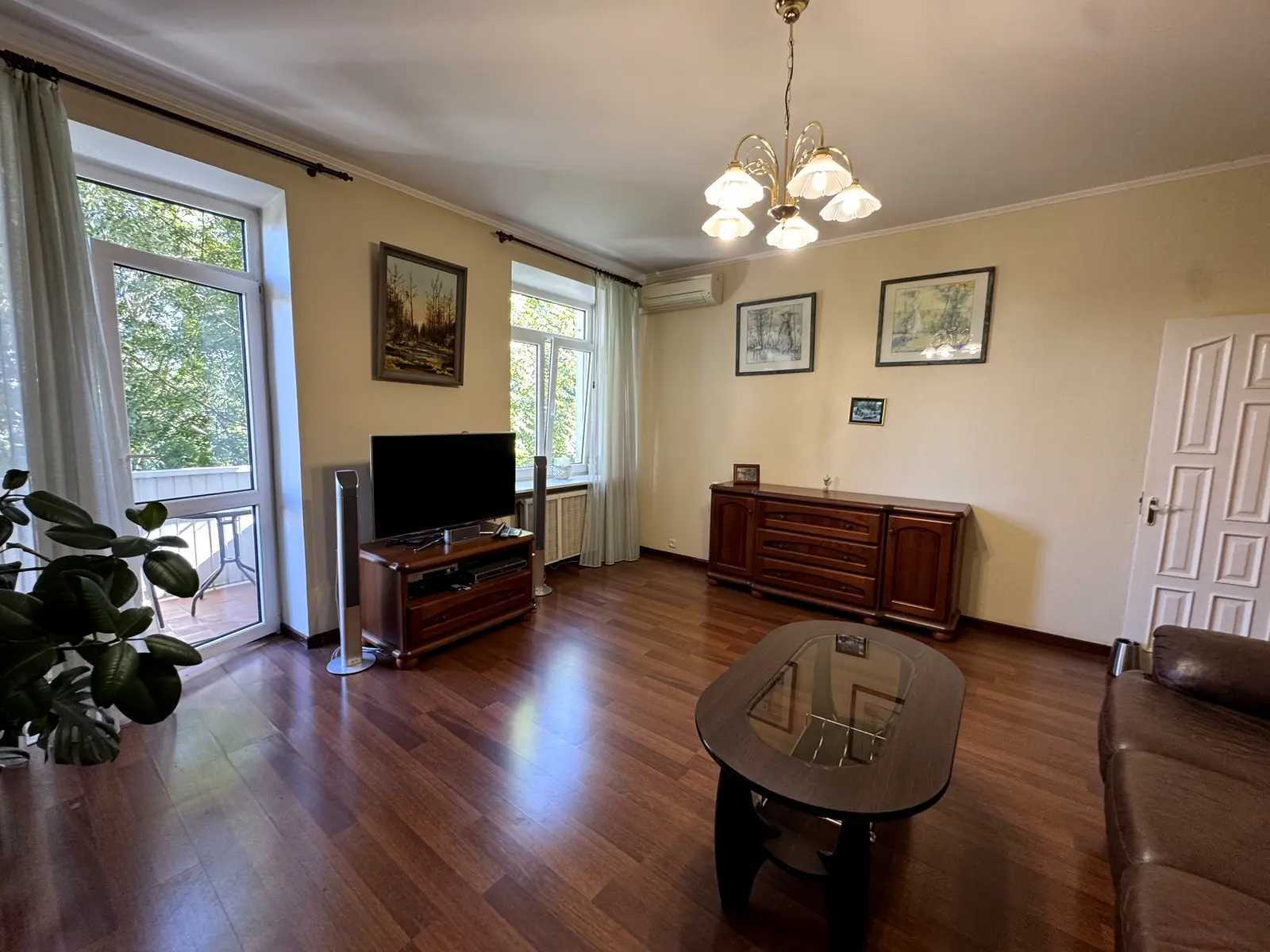 Пропонується простора двокімнатна квартира з якісним ремонтом у Печерському районі. Окрема кухня обладнана усією необхідною технікою, включаючи посудомийну машину, духову шафу та холодильник. Гостиною з телевізором, диваном та виходом на балкон з видом на зелений двір. Спальня з двоспальною ліжком, великим шафою та робочим столом, а також своїм балконом. Санвузол обладнано ванною та туалетом. Є також місткий вхідний шафа для зберігання.