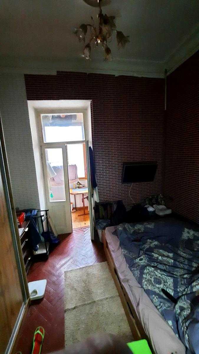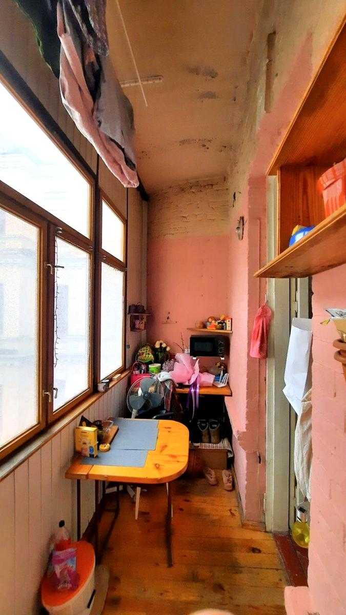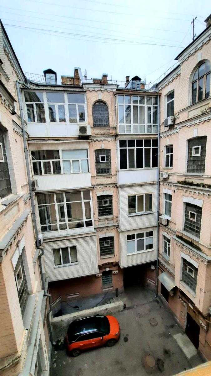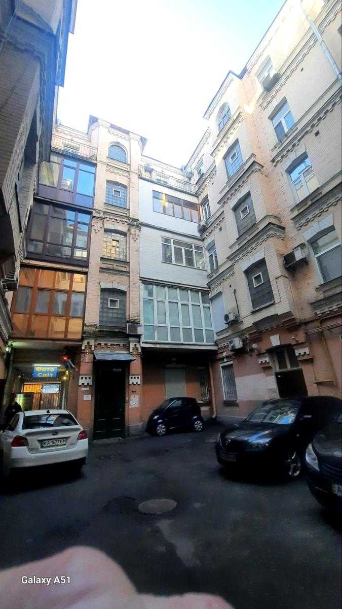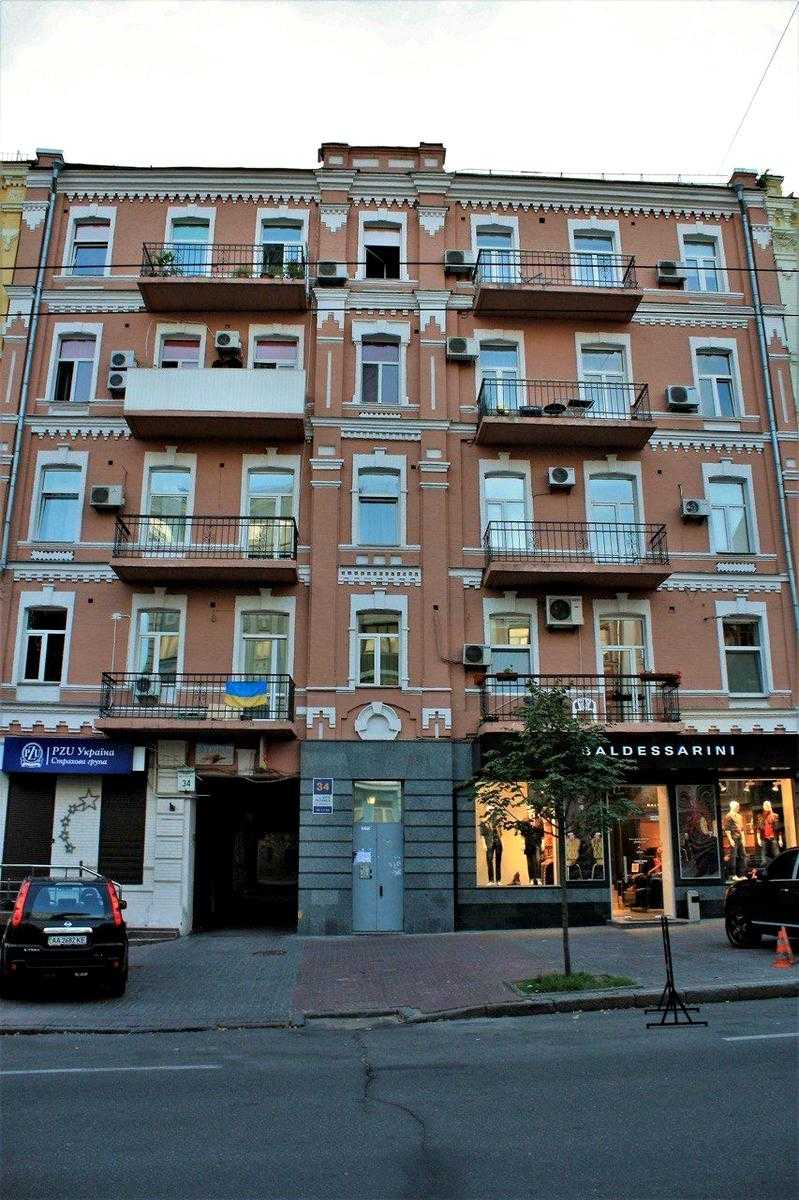 Квартира розташована на вул. Шота Руставелі, 34, у Печерському районі Києва, в пішій доступності від станцій метро "Палац Спорту" та "Л. Толстого". Це пятикімнатна квартира площею 96 м² з роздільним плануванням, житлова площа складає 56 м², кухня має 13 м² з запасним виходом. Квартира знаходиться на 4-му поверсі п'ятиповерхового будинку без ліфта, характеризується високими стелями (3.6 м) та дерев'яними перекриттями. Двостороння квартира має вікна, що виходять у затишний двір. Поряд багато кафе, ресторанів та торгових закладів.