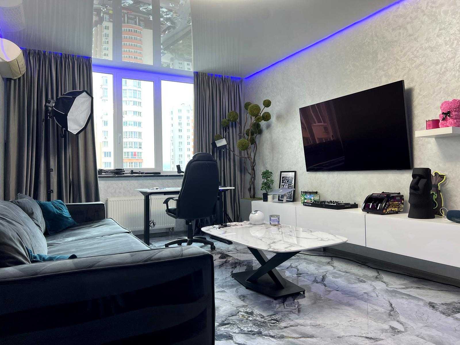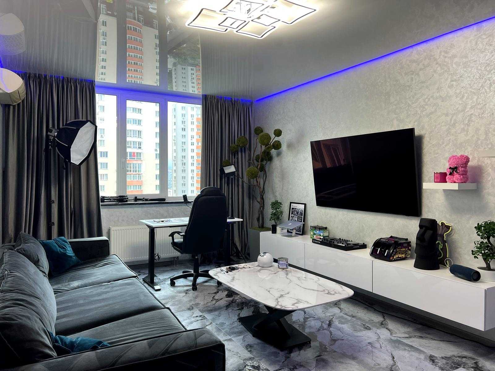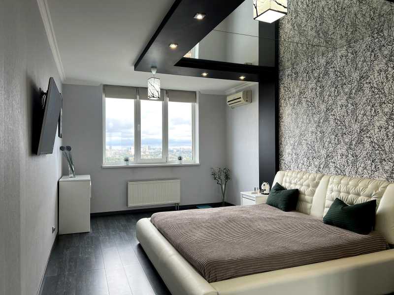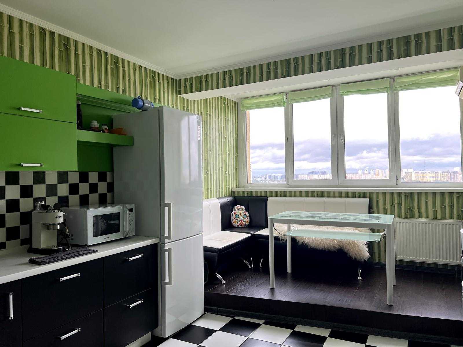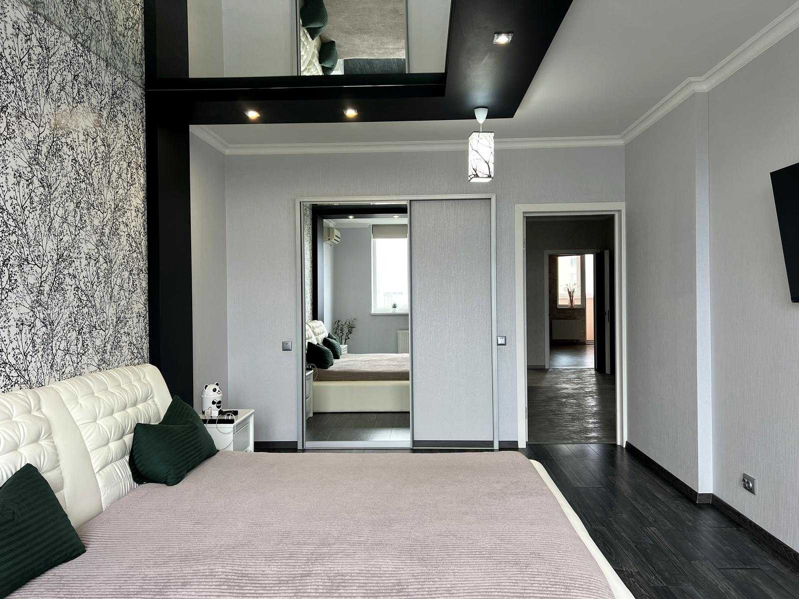 Пропонується квартира у житловому комплексі "4 Сезони" на вул. Михайла Максимовича у Києві, Голосіївський район. Площа квартири становить 115 м², вона має три кімнати, сучасний ремонт та двосторонню орієнтацію. Вікна забезпечують панорамний вид на місто. Квартира повністю мебльована та укомплектована дорогим побутовим приладдям. Включає в себе велику кухню, два санвузли, гардеробну та балкон. Відмінна транспортна доступність, поруч метро Васильківська.