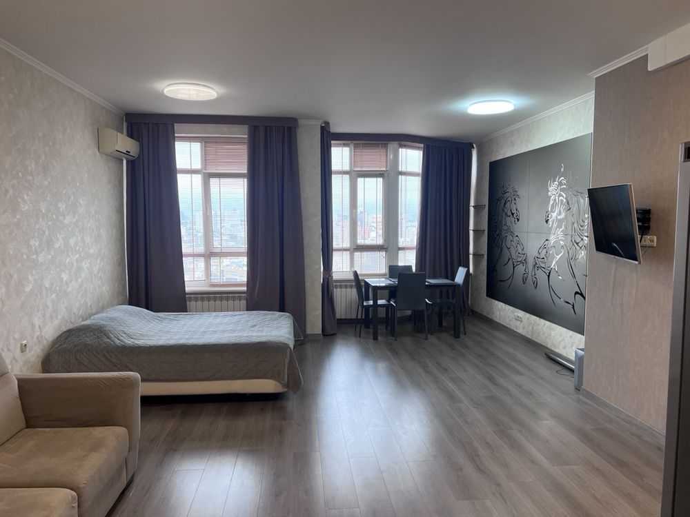 Пропонується 1-кімнатна квартира-студія площею 52 м² в ЖК Елегант. Розташована на 25-му поверсі 32-поверхового будинку. Квартира має панорамні вікна та висоту стель 3 м. Інтер'єр виконаний із якісним ремонтом, меблі та побутова техніка включені. Комплекс знаходиться в центрі Києва, поруч із ботанічним садом, кафе, супермаркетами, а також станціями метро Вокзальна та Університет. Це місце забезпечує зручність і доступ до усієї необхідної інфраструктури.