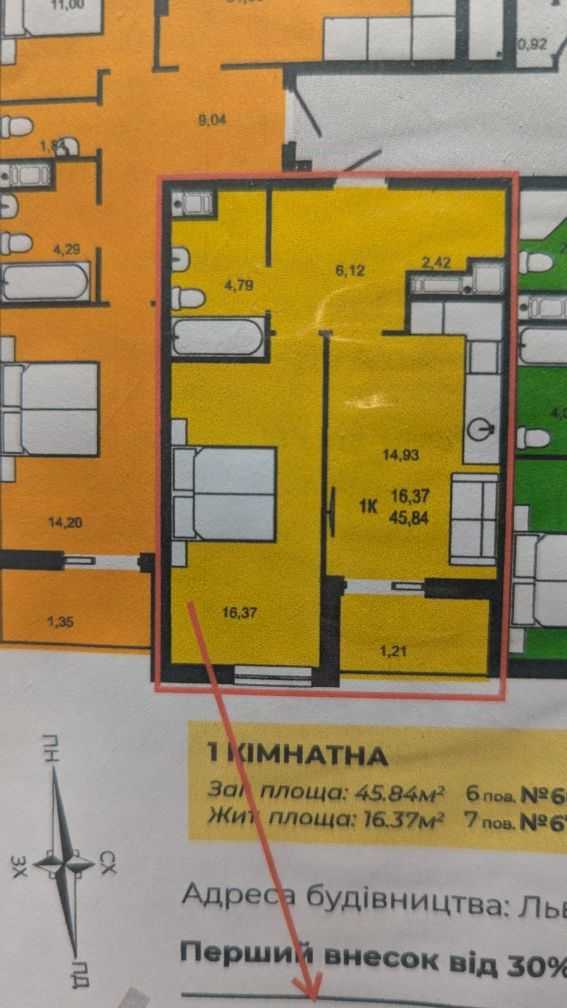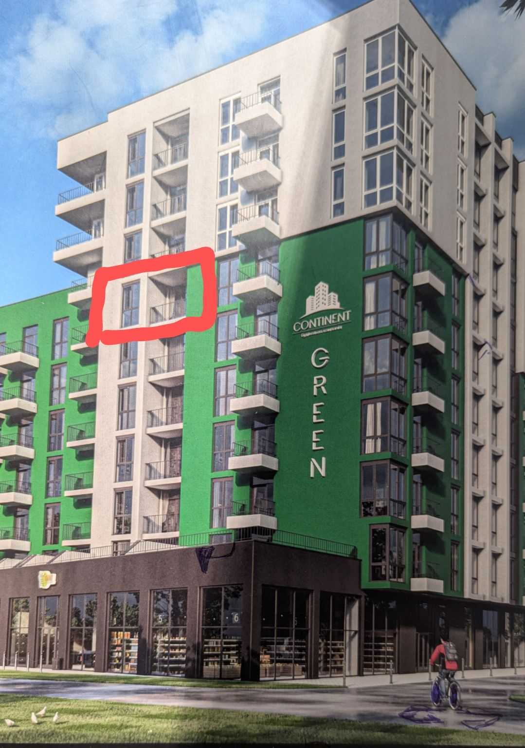 Квартира розташована в житловому комплексі Continent Green, на 6-му поверсі. Площа становить 46 кв. м. Простора гардеробна та відкритий балкон доповнюють комфорт житла. Вікна виходять на сосновий ліс, що забезпечує мальовничий вид на природу та захід сонця. Комплекс знаходиться в стадії завершального етапу будівництва та розташований у живописному місці.