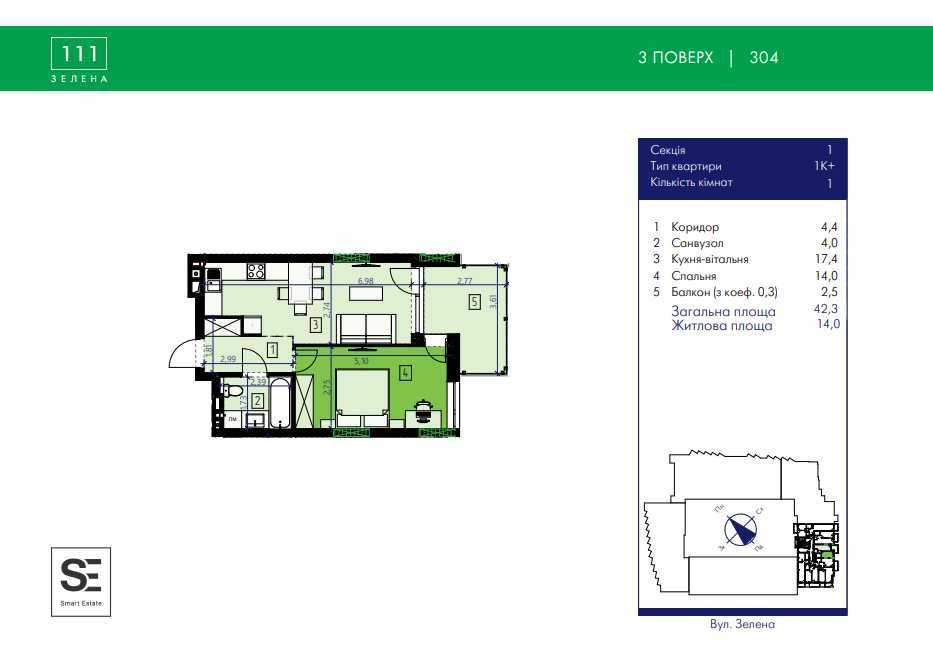 Пропонується 1-кімнатна квартира площею 42,3 м² у житловому комплексі преміум класу ЖК ZELENA, розташованому між парком Погулянка та Снопківським. Квартира знаходиться на 3-му поверсі в 6-ти поверховому будинку. Планування включає простору спальню з панорамним вікном, кухню-вітальню з виходом на балкон, санвузол. Вікна виходять на південний-схід. Будинок оснащений індивідуальним тепловим насосом, бойлером, системами для опалення та кондиціювання. Окруження забезпечує закриту територію, підземний паркінг, спортмайданчики та зони відпочинку.