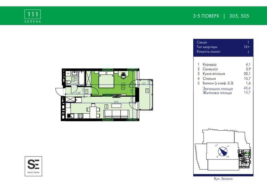 Квартира в ЖК Zelenа, площею 45,4 м², розташована на 3-му поверсі нового шестиповерхового будинку. Кухня-вітальня з панорамним вікном та виходом на балкон, простора спальня, санвузол. Якісні матеріали: індивідуальний тепловий насос, панорамні вікна Gealan, системи обліку комунікацій. Комплекс пропонує підземний паркінг, закриту територію, смарт-управління мікрокліматом. Вся інфраструктура для комфортного життя: спортзали, зони для відпочинку. Розташування у зеленій зоні, поруч з парком.