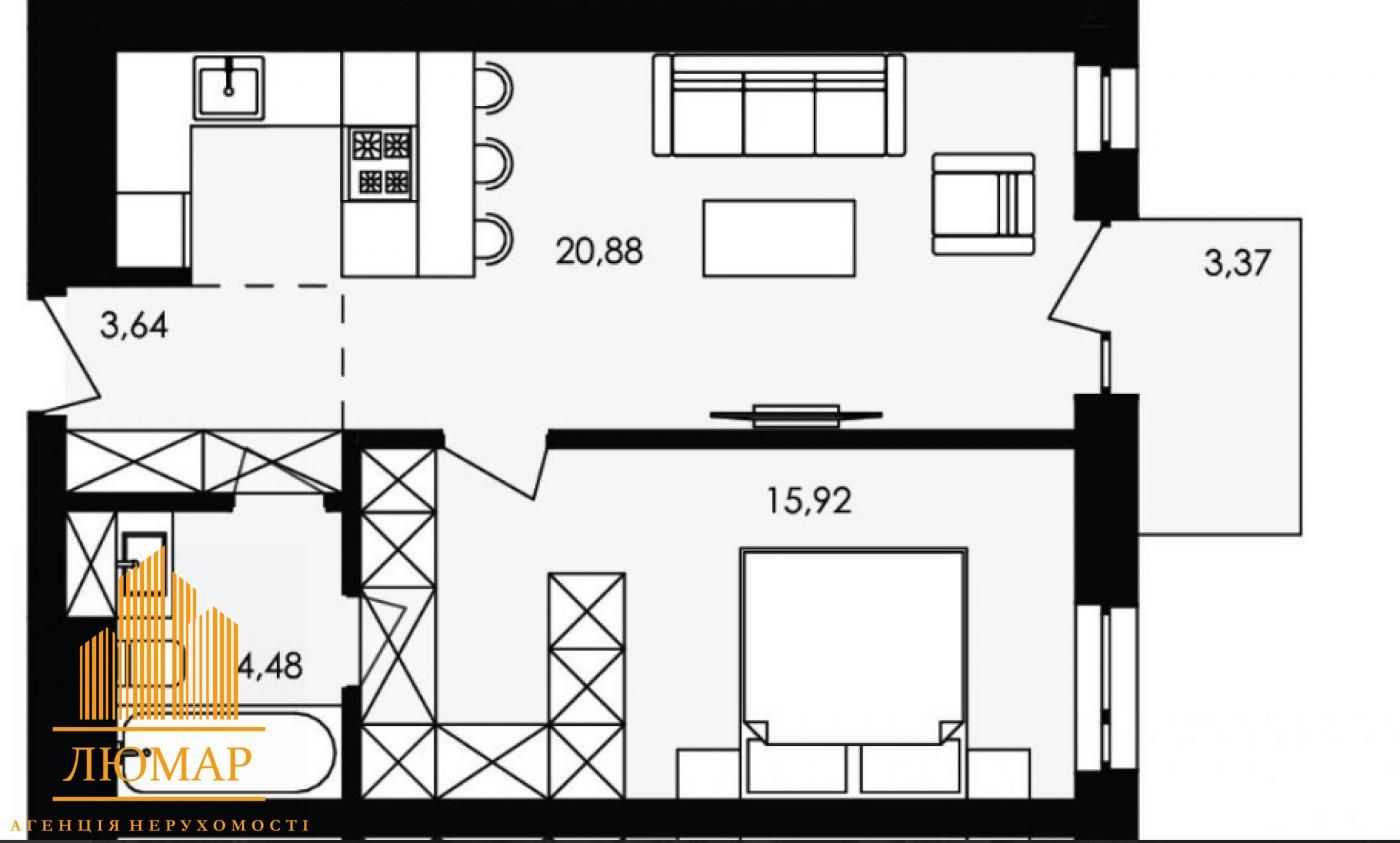 Пропонується 1 кімнатна квартира в ЖК бізнес класу Avalon Yard по вул. Замарстинівська, 76. Загальна площа становить 46.7 м², з житловою площею 15.92 м² та кухнею-студією 20.88 м². Квартира розташована на 4-му поверсі 7-поверхового будинку. В ній є вихід на балкон, санвузол, гардероб та ізольована спальня. Панорамні вікна відкривають вид на затишний двір. Будинок обладнаний відеоспостереженням, конс'єржем та паркінгом. Розвинута інфраструктура: поруч кафе, ТЦ, зупинка громадського транспорту та інше.