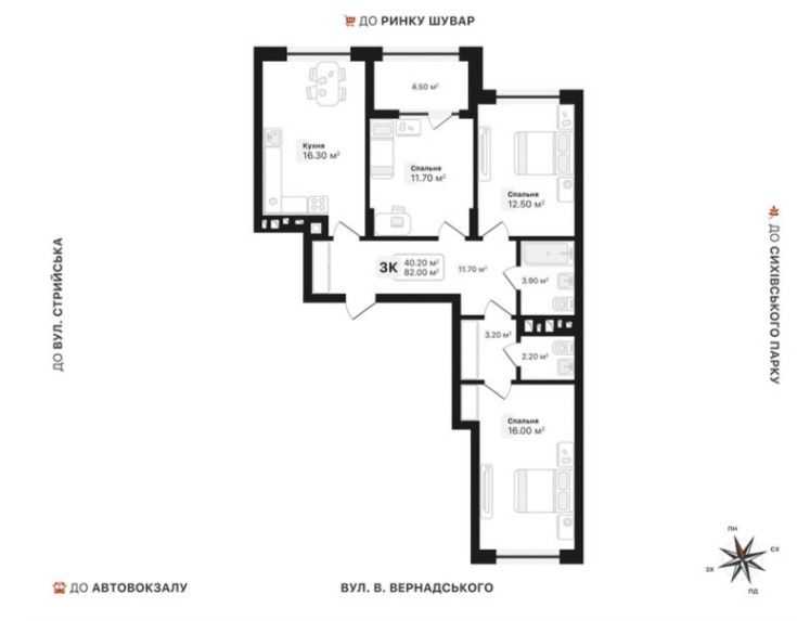 Пропонується 3-кімнатна квартира в Сихівському районі Львова, на вул. Вернадського. Загальна площа складає 82 м², кухня - 16,3 м². Квартира має два санвузли, простору гардеробну та велику лоджію. Передбачено індивідуальне газове опалення. Комплекс характеризується двором без машин для безпеки мешканців та якісними матеріалами будівництва. У районі розвинена інфраструктура, що забезпечує комфортне проживання.