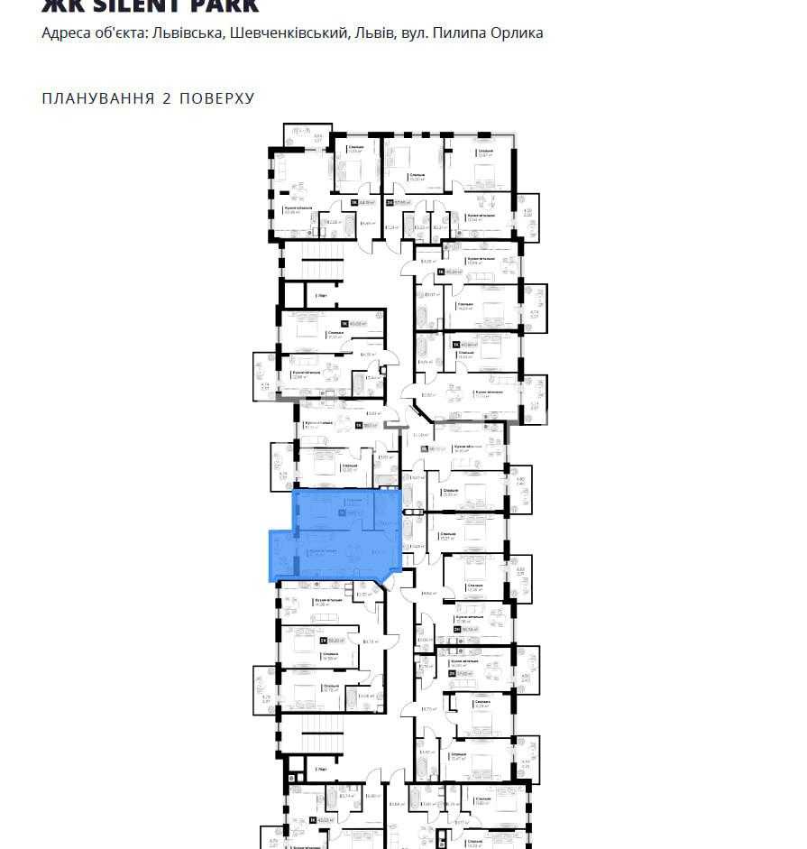 Пропонується однокімнатна квартира в ЖК Silent Park по вул. Орлика Пилипа в Львові. Загальна площа 38,81 м², житлова – 12,95 м², кухня – 15,29 м². Квартира розташована на 2 поверсі п'ятиповерхового монолітно-каркасного будинку, висота стелі становить 2,8 м. В квартирі встановлено індивідуальне газове опалення. ЖК Silent Park відзначається облагородженою територією, двохрівневим паркінгом та власною торговою галереєю.