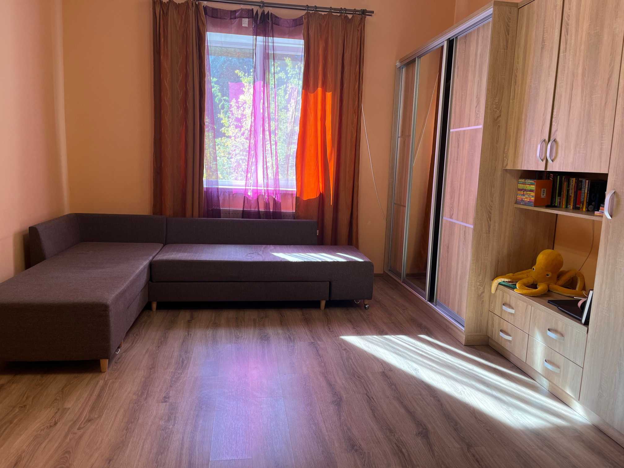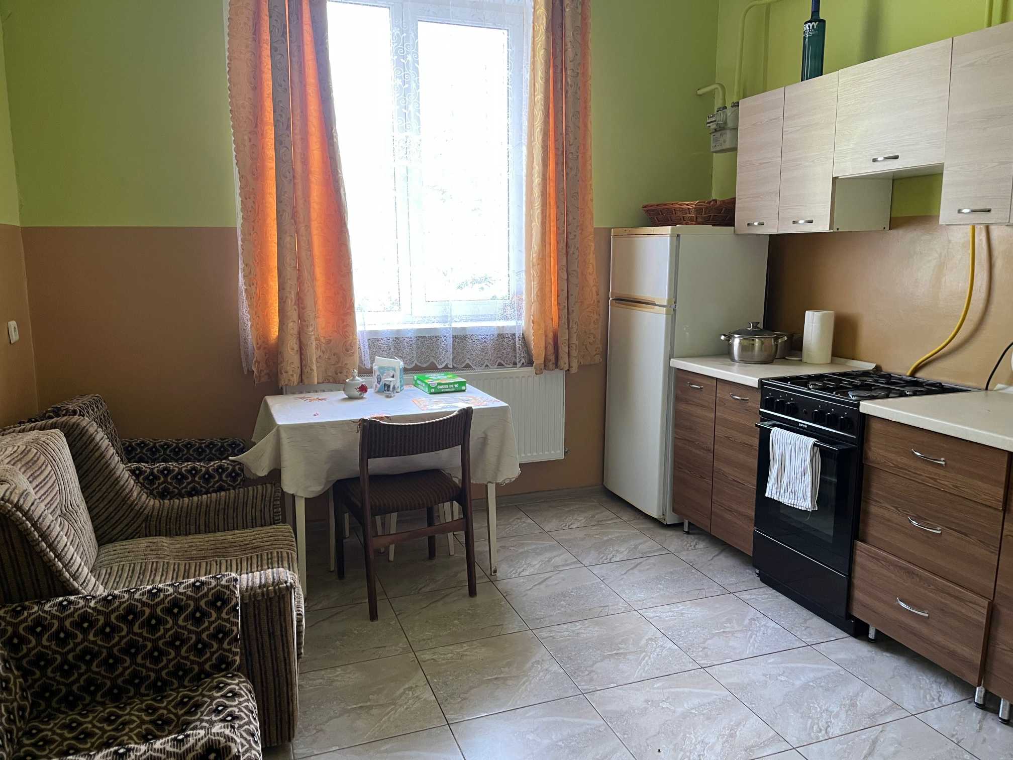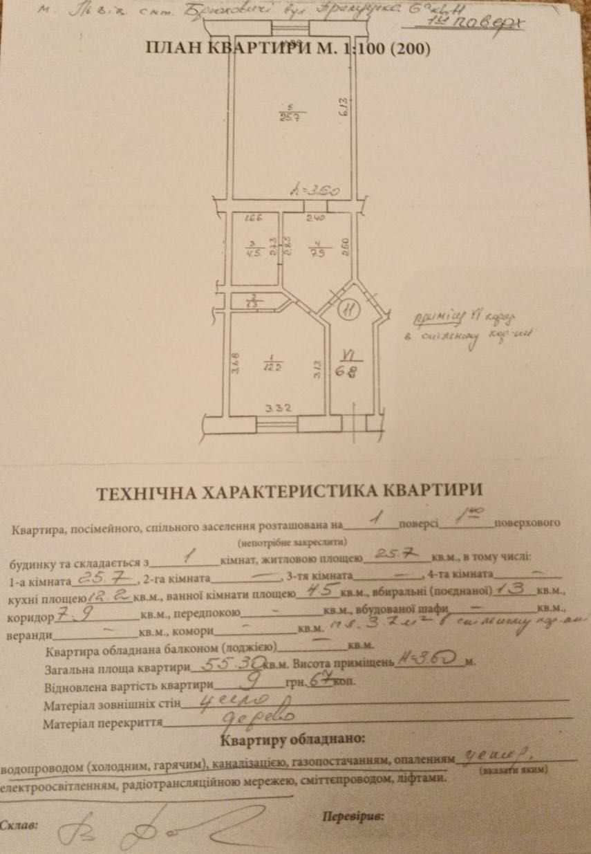 Однокімнатна квартира на першому поверсі в смт. Брюховичі, Львівської області, вул. Прилуцька 6А, кв.11. Загальна площа 55.30 м², кімната 27.7 м², кухня 12.2 м², обʼєднана ванна кімната 13 м², коридор 7.9 м², кладова 1 м², висота стель 3.5 м. Індивідуальне газове опалення. Квартира мебльована, включає пральну машину, холодильник, проведено інтернет. Охоронювана територія, паркомісця на 2 авто. В околицях сосни та ялинки.