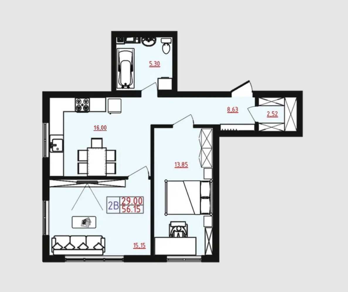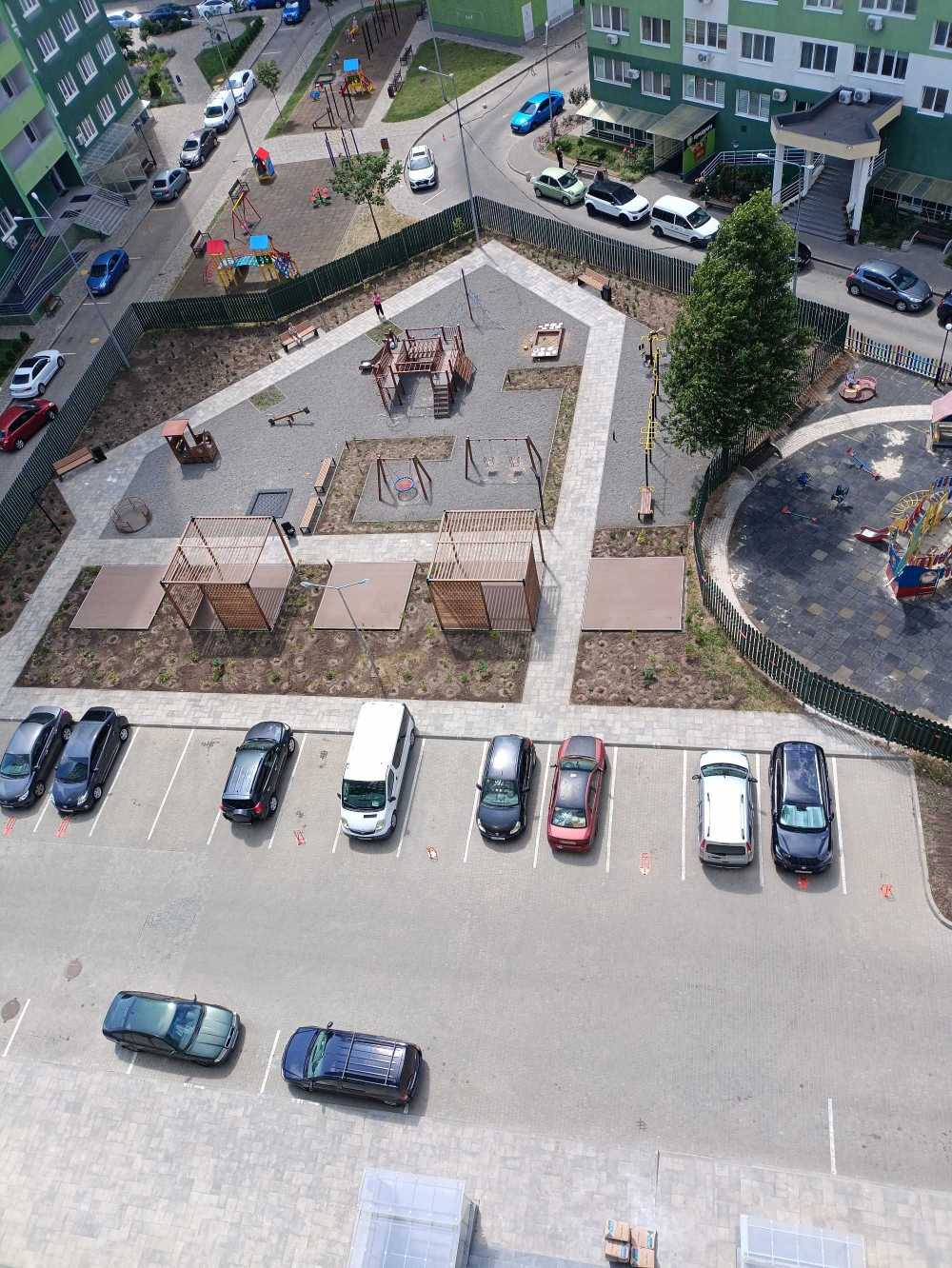 2-кімнатна квартира у новому зданому будинку загальною площею 56 кв. м. знаходиться на закритій території з охороною та відеонаглядом. Прибудинкова територія обладнана зарядками для електромобілів, підземними баками для відходів та електричними підйомниками для колясок.
