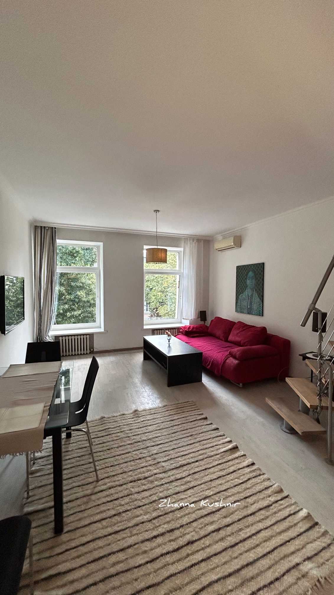 Квартира розташована в історичному центрі Одеси, на вулиці Дерибасівській. Це двоповерхова квартира з ремонтами, що включає кухню-гостіни з диваном. Окна виходять на Дерибасівську. Кухня оснащена газовою плитою, духовкою та холодильником. Спальня має зручне ліжко, а санвузол обладнаний ванною і пральною машиною. На другому рівні розташована ще одна спальня з вікном у потолку, а також душова і гардеробна. Парадна повністю відреставрована.