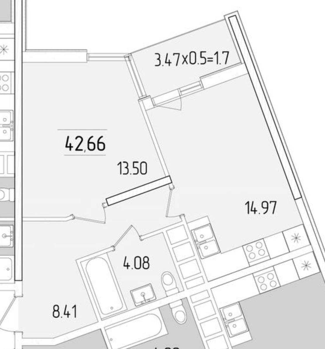 Пропонується однокімнатна квартира в ЖК "67 Перлина" на вулиці Краснова. Площа квартири складає 42.66 кв.м., з житловою зоною 13.5 кв.м. і кухнею площею 14.97 кв.м. Квартира розташована на 19-му поверсі 24-поверхового будинку, що забезпечує чудовий вид на околиці.