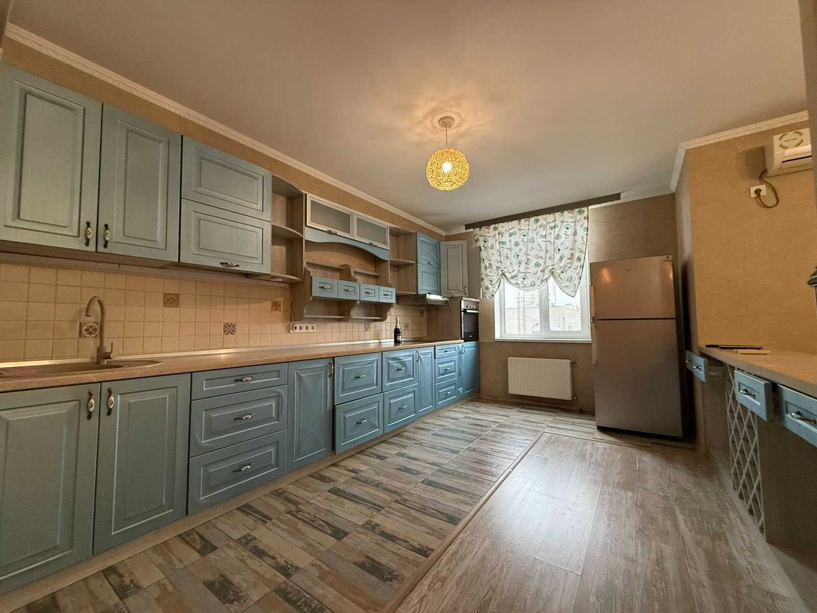 Трикімнатна квартира в ЖК Романовський, зданому в 2014 році. Монолітно-каркасний будинок з газобетонними перегородками між кімнатами. В квартирі велика кухня-студія з електрокаміном, дві окремі кімнати, а також балкон із заскленим простором. Оновлена техніка та виконаний ремонт. На території комплексу розташовані дитячий садок, танцювальні студії та інші заняття. В околицях доступні три школи, дитячий садок, різні медичні заклади та Дюковський парк.