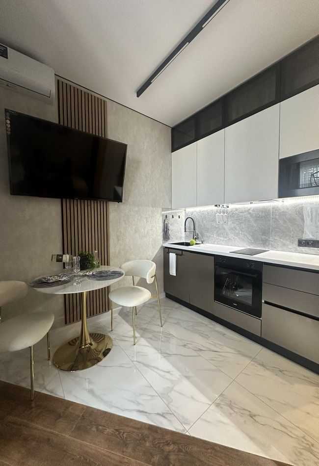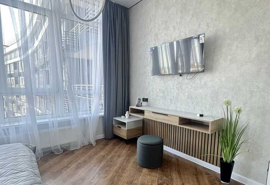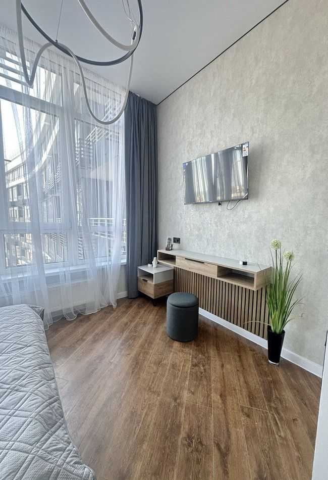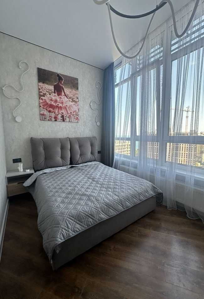 Одеса, ЖК Атмосфера, 1 кімнатна квартира в Аркадії. Повністю укомплектована меблями та технікою. Особливістю є панорамні вікна та ергономічне планування: спальня з комфортним ліжком, кухня-студія та гостьова зона з розкладним диваном. У комплексі наявні тераси для відпочинку на даху з ландшафтним дизайном, охоронювана територія, швидкісні ліфти та двохрівневий підземний паркінг.