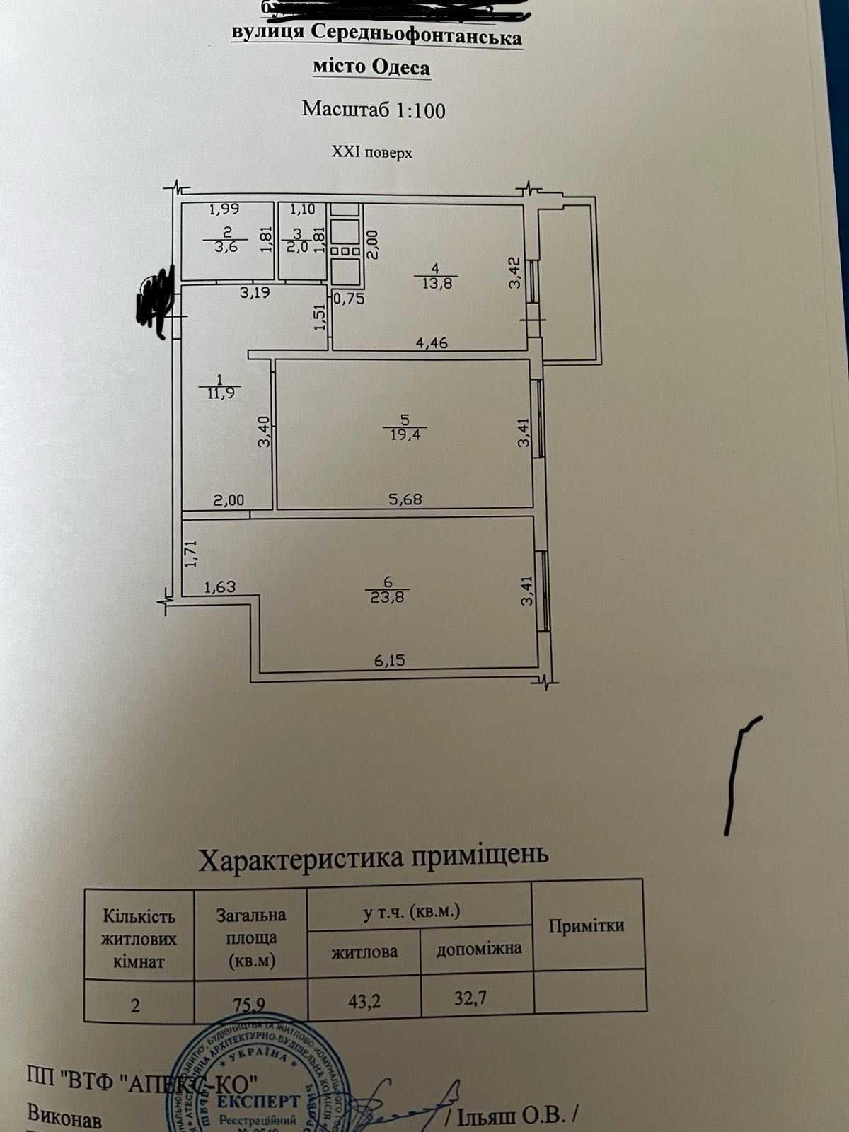 Пропонується двокімнатна квартира в ЖК Апельсин на вулиці Середньофонтанській. Площа квартири складає 76 м², включає кімнати розміром 23,8 м² та 19,4 м² з роздільними входами, кухню площею 13,8 м² з лоджією. Квартира знаходиться на 21 поверсі 25-поверхового будинку, який вже заселений. На території комплексу є магазин, парикмахерська, дитяча закрита площадка та парковка. Зручне розташування - поруч всі необхідні об'єкти інфраструктури.