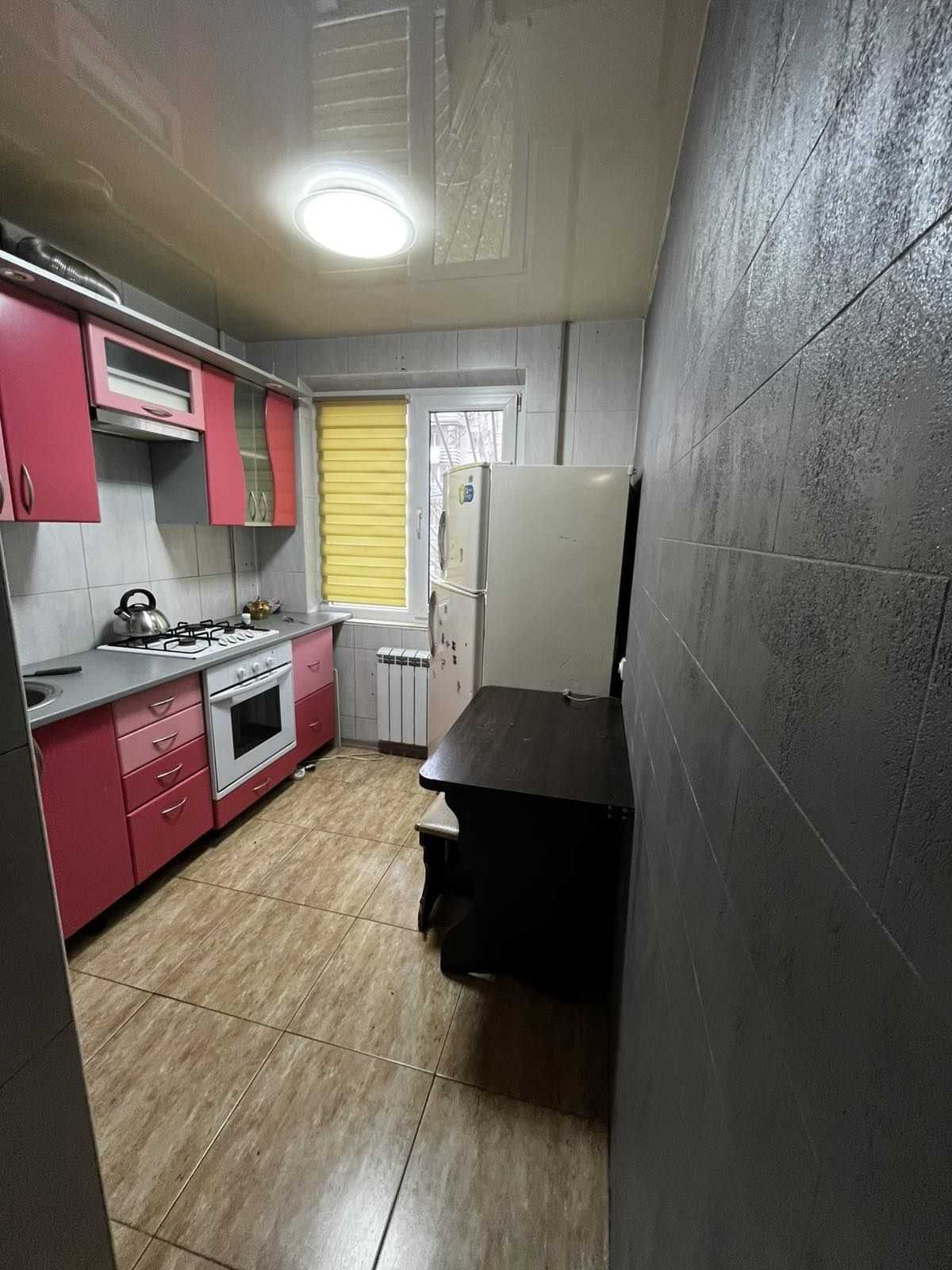 Однокімнатна квартира на пос. Котовського з меблями та технікою. Житловий стан. У квартирі залишаються всі необхідні речі: вбудована кухня, електрична духовка, газова плита, холодильник, пральна машина, кондиціонер, два дивани, розкладне крісло, комп'ютерний стіл з шафами. Якісний санвузол, решітки на вікнах. Перший поверх, балкона немає. Встановлені навісні потолки, плитка на підлозі в кухні та ванній. Проводяться комунікації, є інтернет. Двері в під'їзд на замку, тихий двір, є місце для авто. Поблизу розташовані школа, садок, стадіон, магазини та зупинки громадського транспорту.